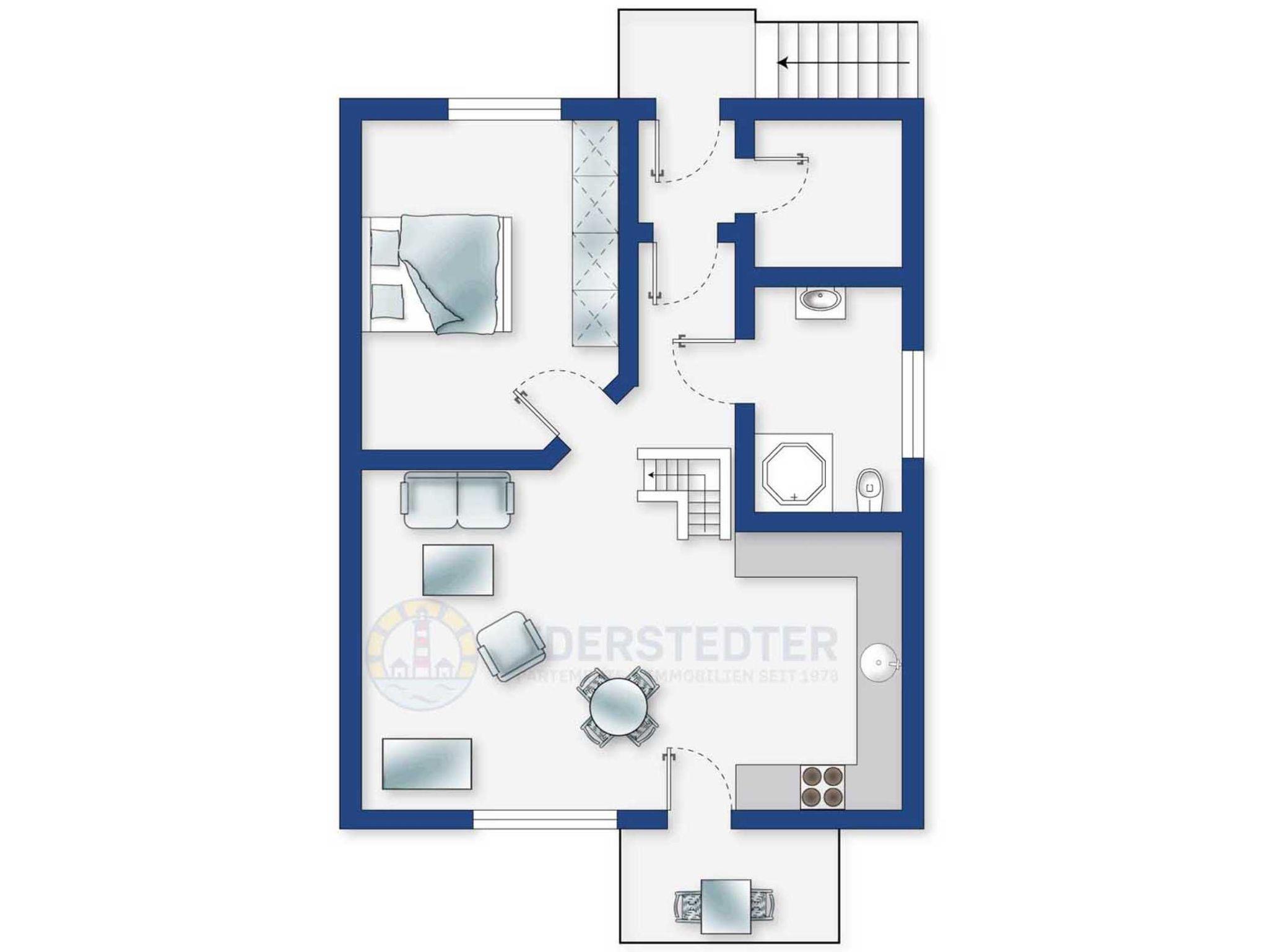 Moderne 3-Zimmer-Ferienwohnung Brynjulf Bie mit ca. 55 qm auf 2 Ebenen (OG, DG, Zugang über Außentreppe) für bis zu 4 Personen (Wohlfühlbelegung: max. 2 Erwachsene). In ruhiger, zentrumsnaher Lage im Ortsteil Dorf in St. Peter-Ording. Zur Wohnung gehören ein Balkon und ein Sonnenfreisitz vor einem der Gartenhäuser.
