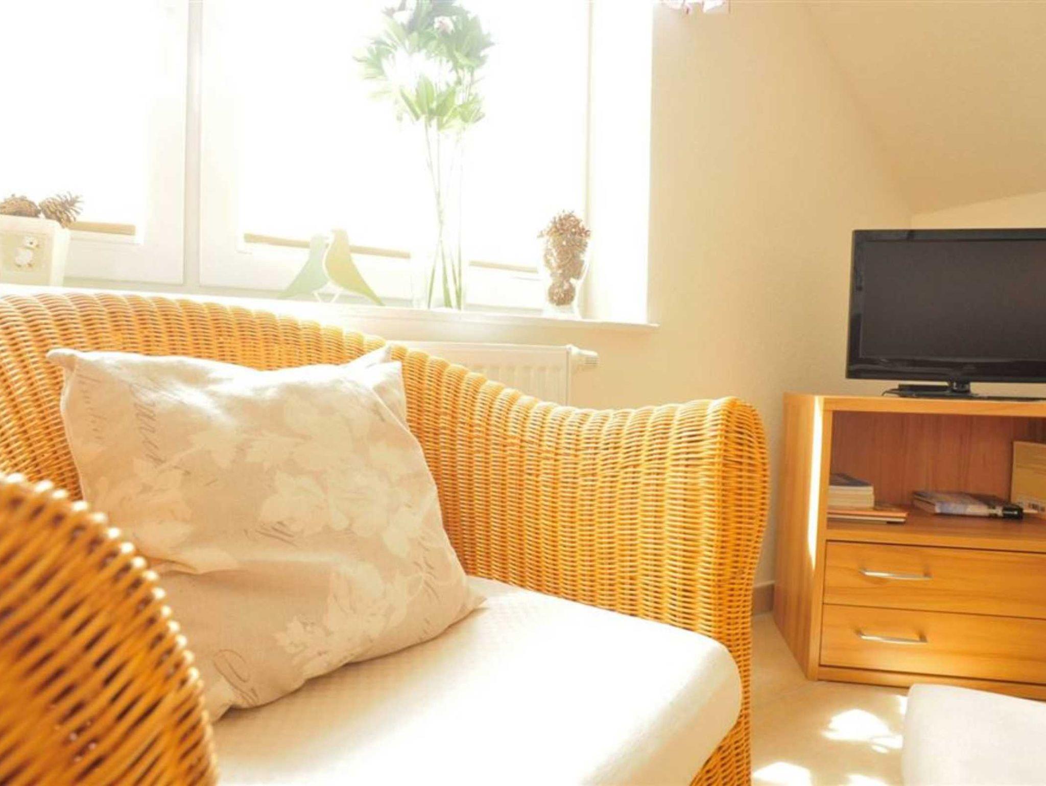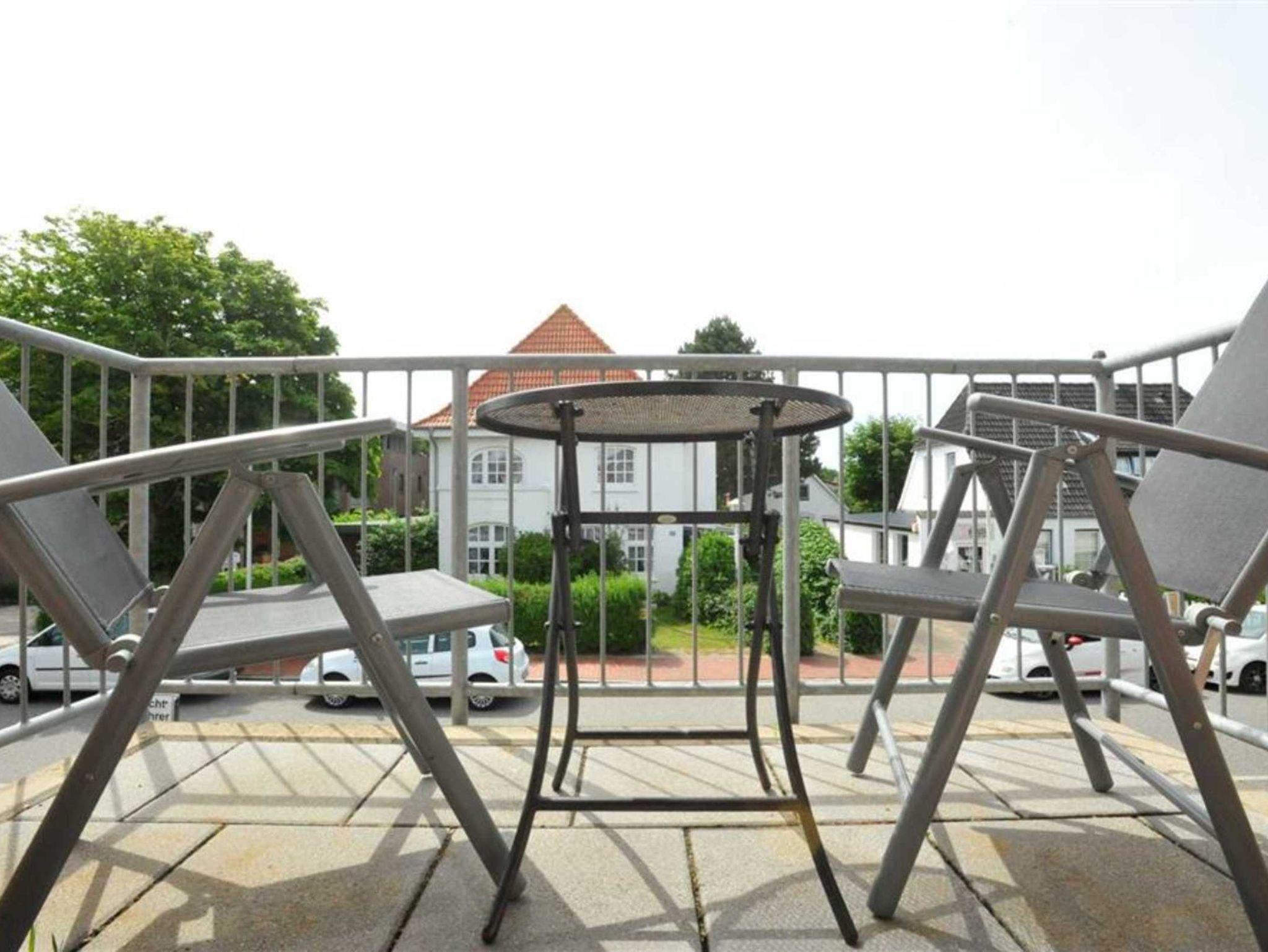 Wohnzimmer mit Sofa (2er), Sessel, TV (Sat), Radio und Esstisch mit 4 Stühlen. Direkter Zugang zum möblierten Südbalkon. Offene Küche mit Backofen, Kühlschrank mit Gefrierfach und Geschirrspüler.