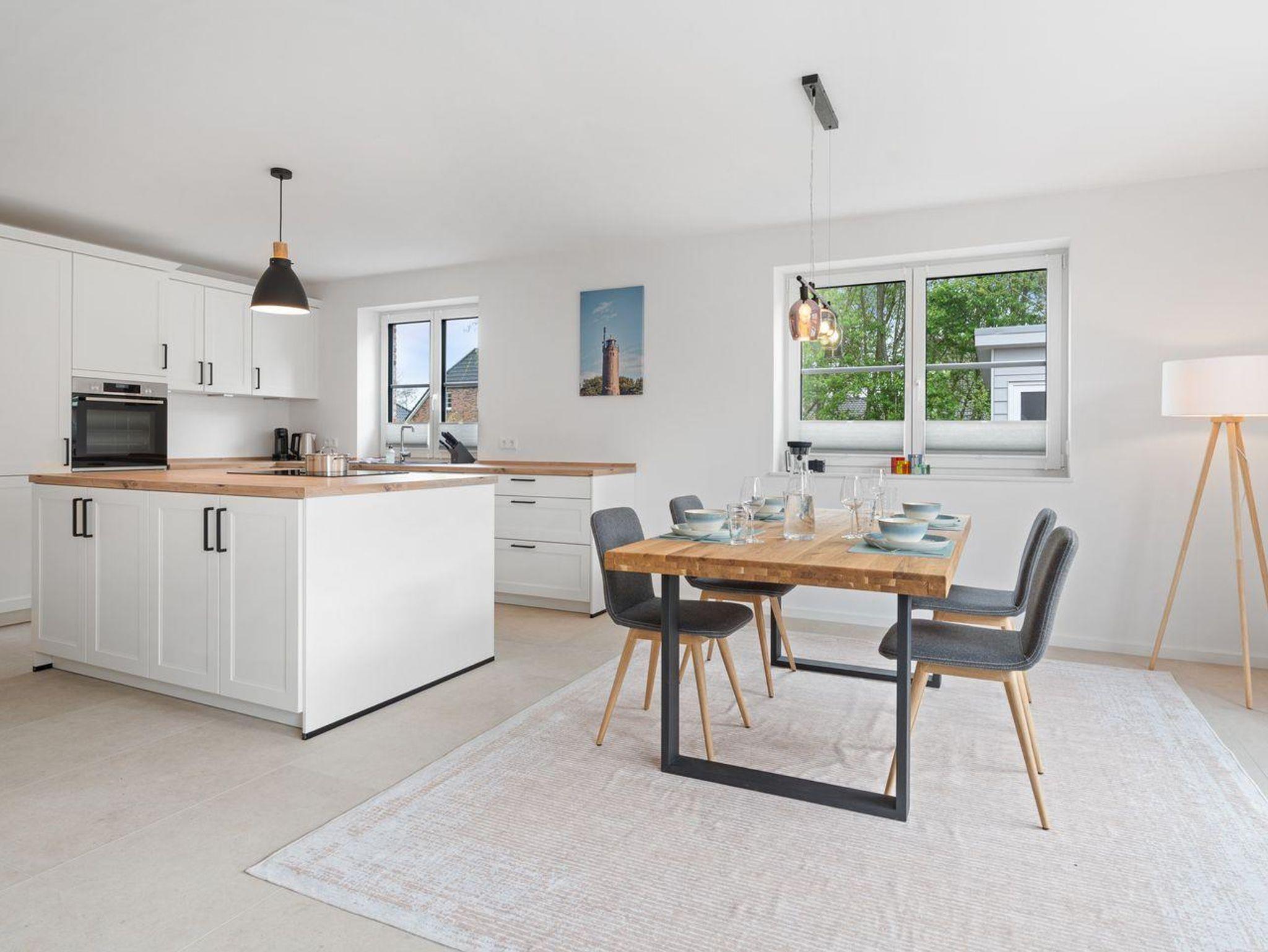 Das Herzstück der Unterkunft ist die offene Küche, die harmonisch mit dem Wohnzimmer verbunden ist und zum gemeinsamen Kochen und Entspannen einlädt. Die moderne Küche ist mit einem Induktionsherd, Backofen, Kühlschrank mit Gefrierfach und Geschirrspüler ausgestattet. Ein Wasserkocher und eine Kaffeemaschine sorgen für den perfekten Start in den Tag