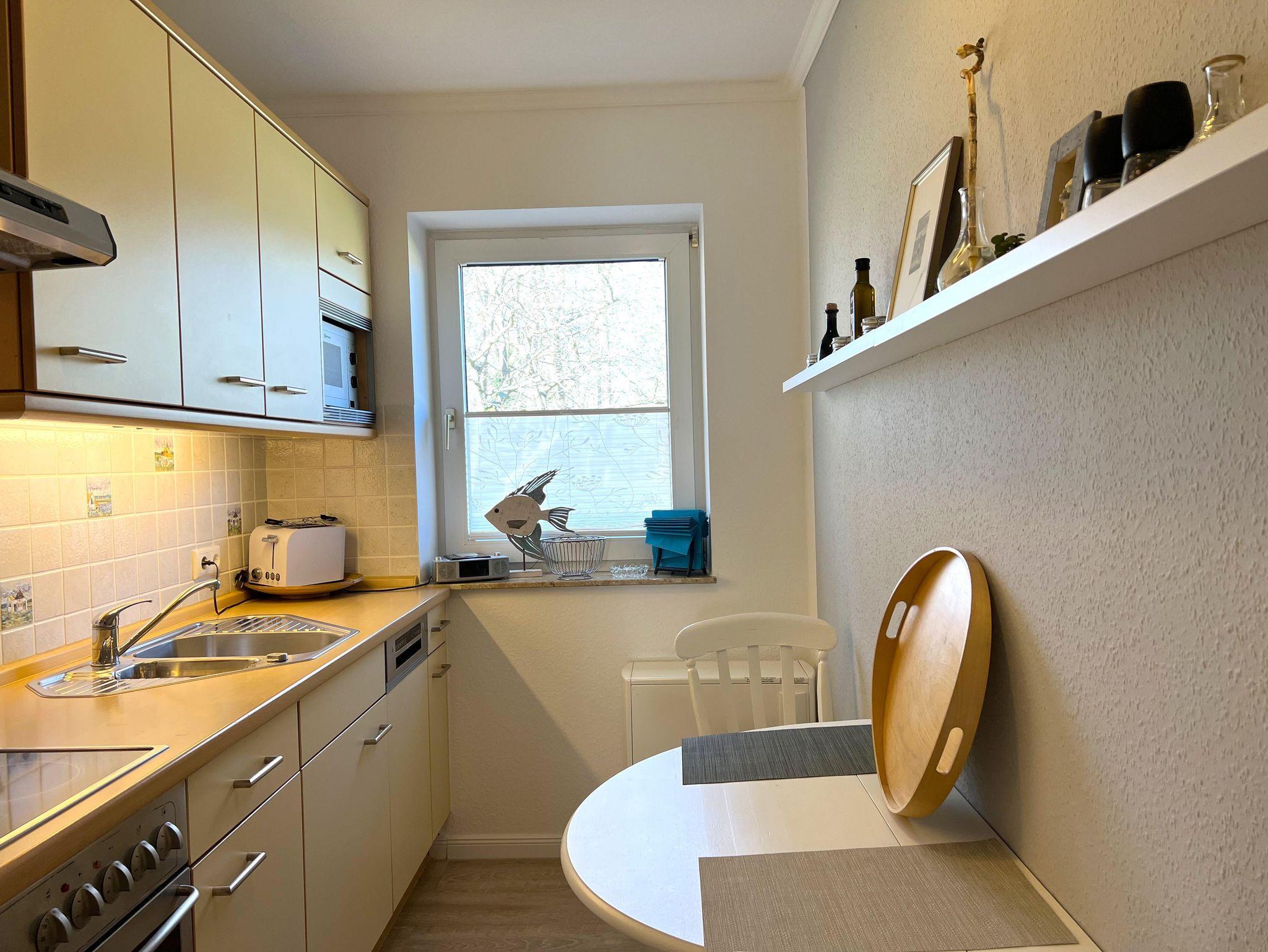 Küche: Einbauküche, 4 Plattenherd mit Ceranfeld und Backofen, Kühlschrank, Spülmaschine, Mikrowelle, Kaffeemaschine, Wasserkocher, Eierkocher, Handmixer, Esstisch, 4 Stühle, Nachtspeicherofen, Geschirr, Kochtöpfe