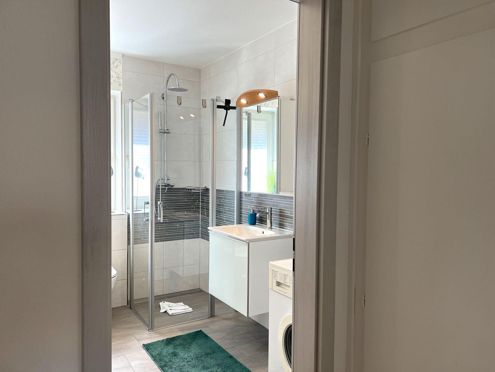 Bad: Dusche, Waschbecken, WC, Waschmaschine, Spiegelschrank, Duschkabine
