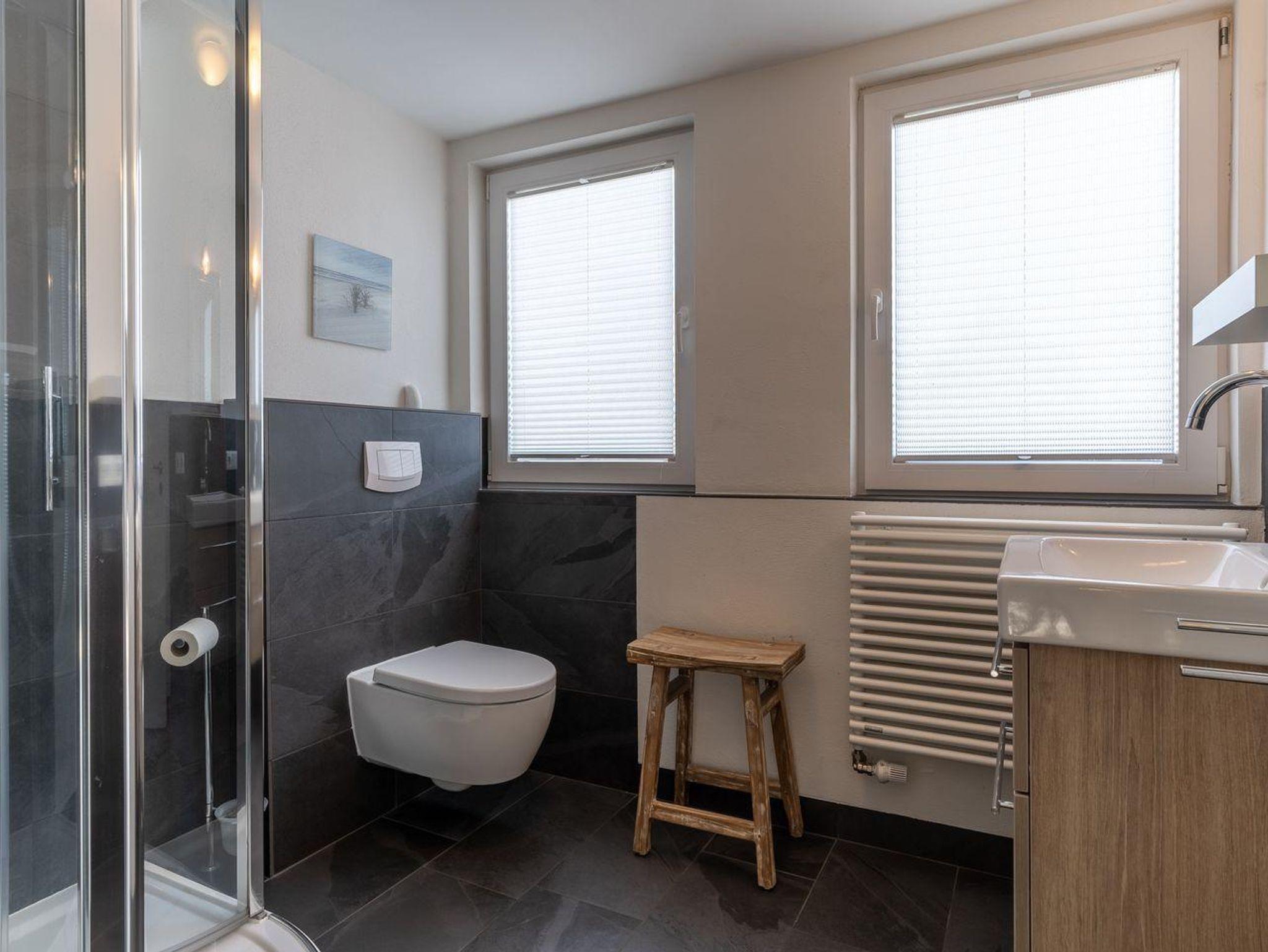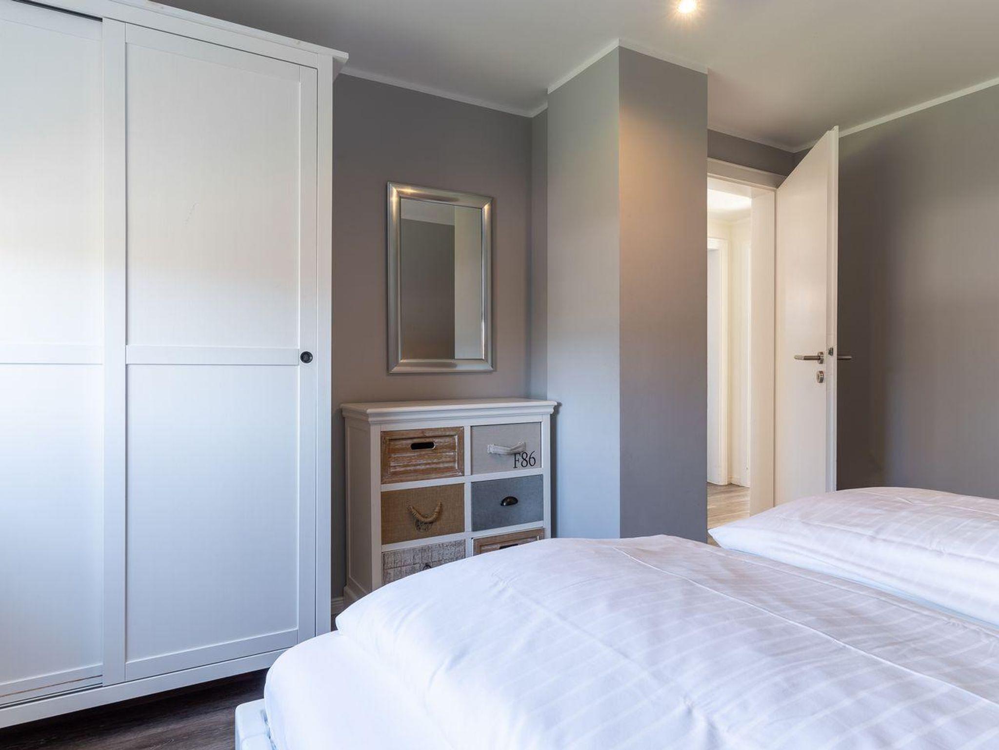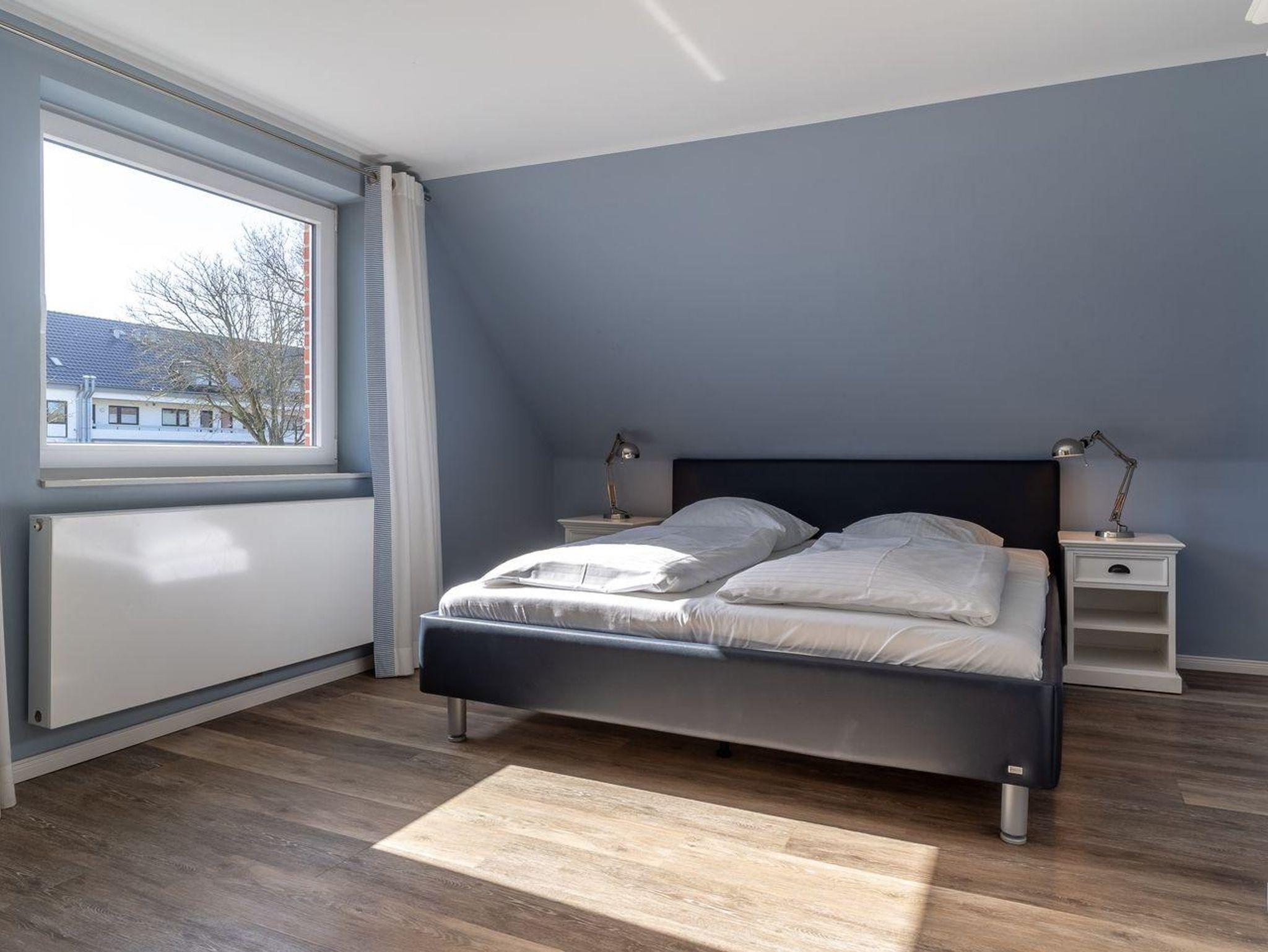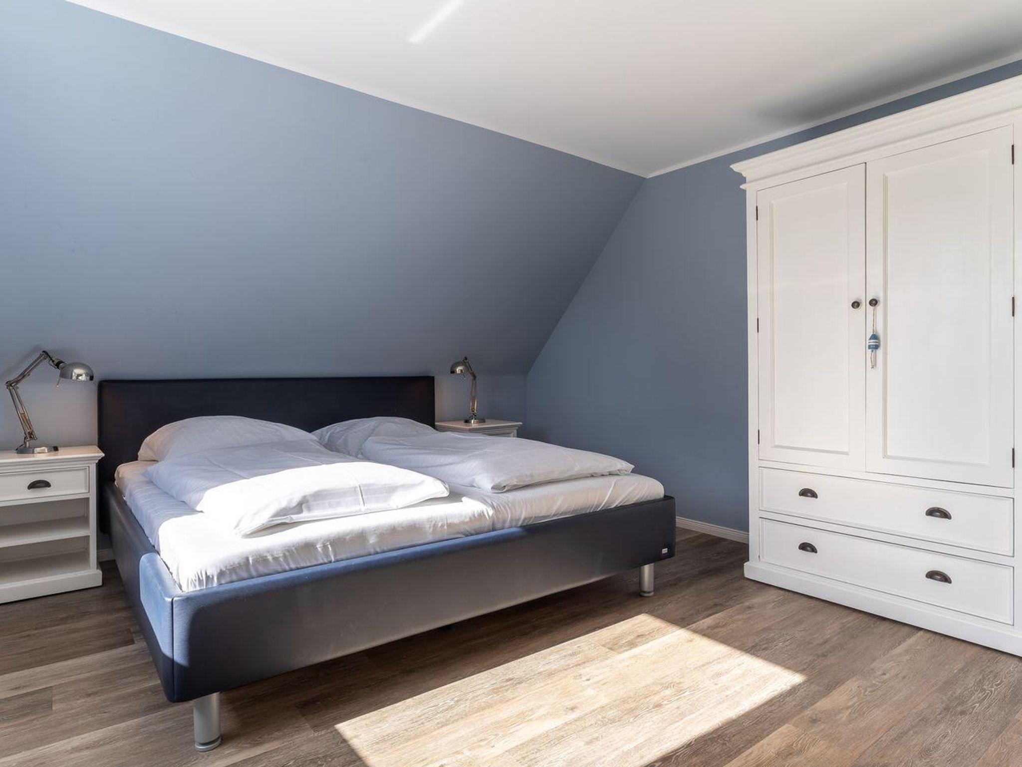Über eine Holztreppe gelangt man in das Obergeschoss. Die drei Schlafzimmer, zwei mit je einem Doppelbett und eines mit einem Einzelbett sorgen für ruhmvolle Erholung. Darüber hinaus befindet sich im Obergeschoss ein weiteres Duschbad. Von einem der geräumigen Doppelschlafzimmer gelangt man auf eine sonnige Dachterrasse und kann den Tag mit vollem Lichteinfluss starten.