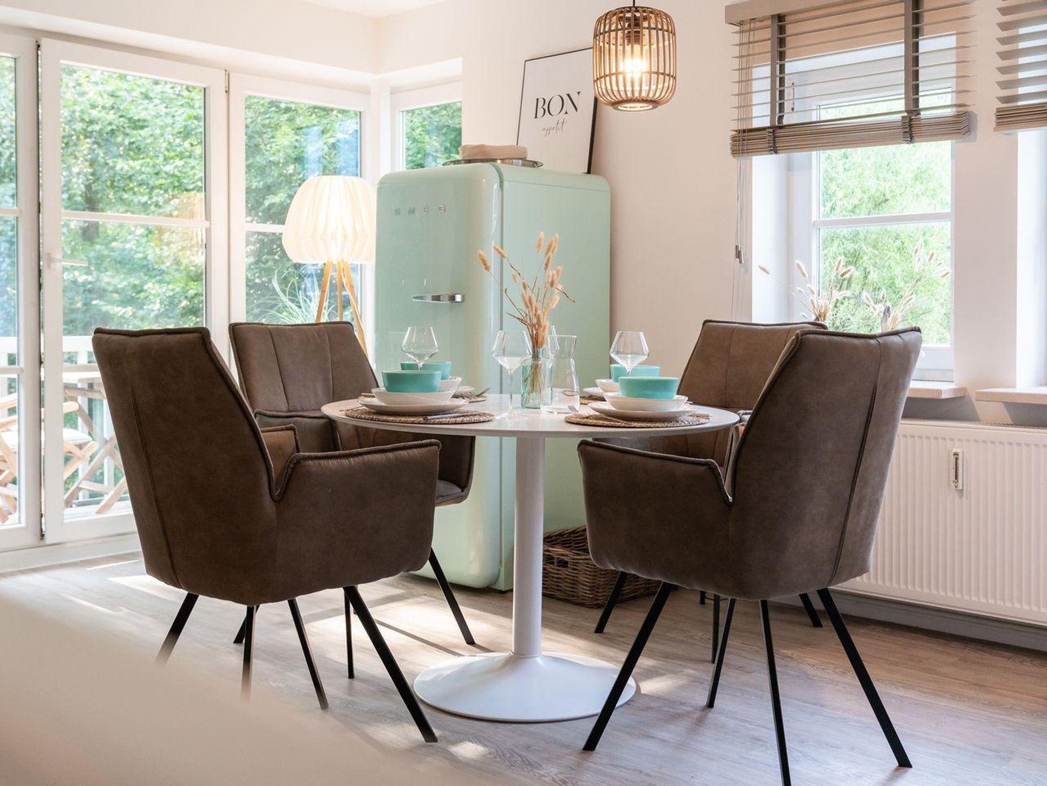 Das Wohnzimmer lädt mit einem stilvollen Sofa, einem großartigen Smart-TV und einem Esstisch mit 4 Stühlen zum Verweilen ein. Es bietet zudem direkten Zugang zum möblierten Balkon in südlicher Ausrichtung. Die offene Küche ist voll ausgestattet mit einem Induktionsfeld, einem Backofen, Mikrowelle, einer Kühl-Gefrier-Kombination und einem Geschirrspüler.