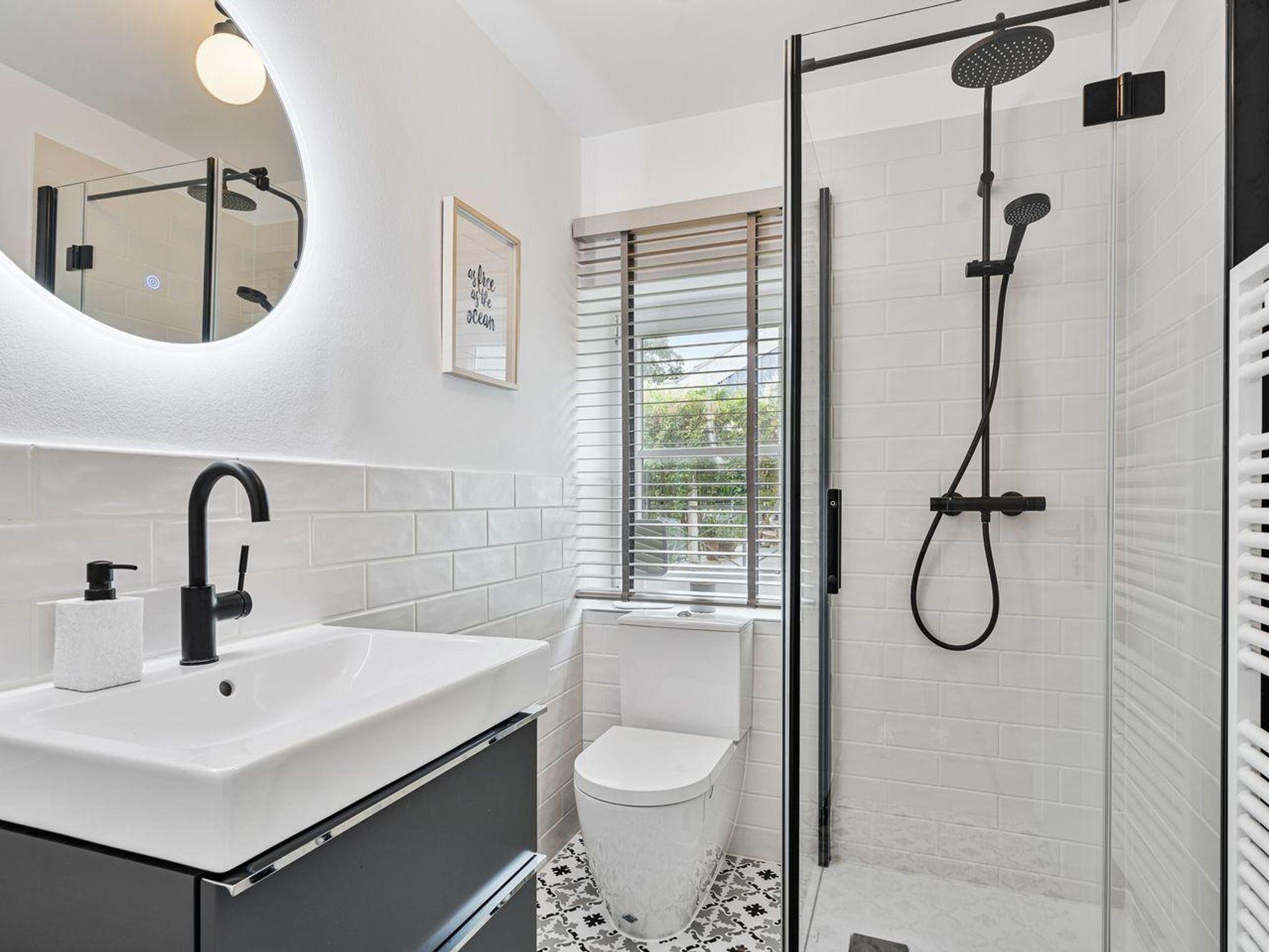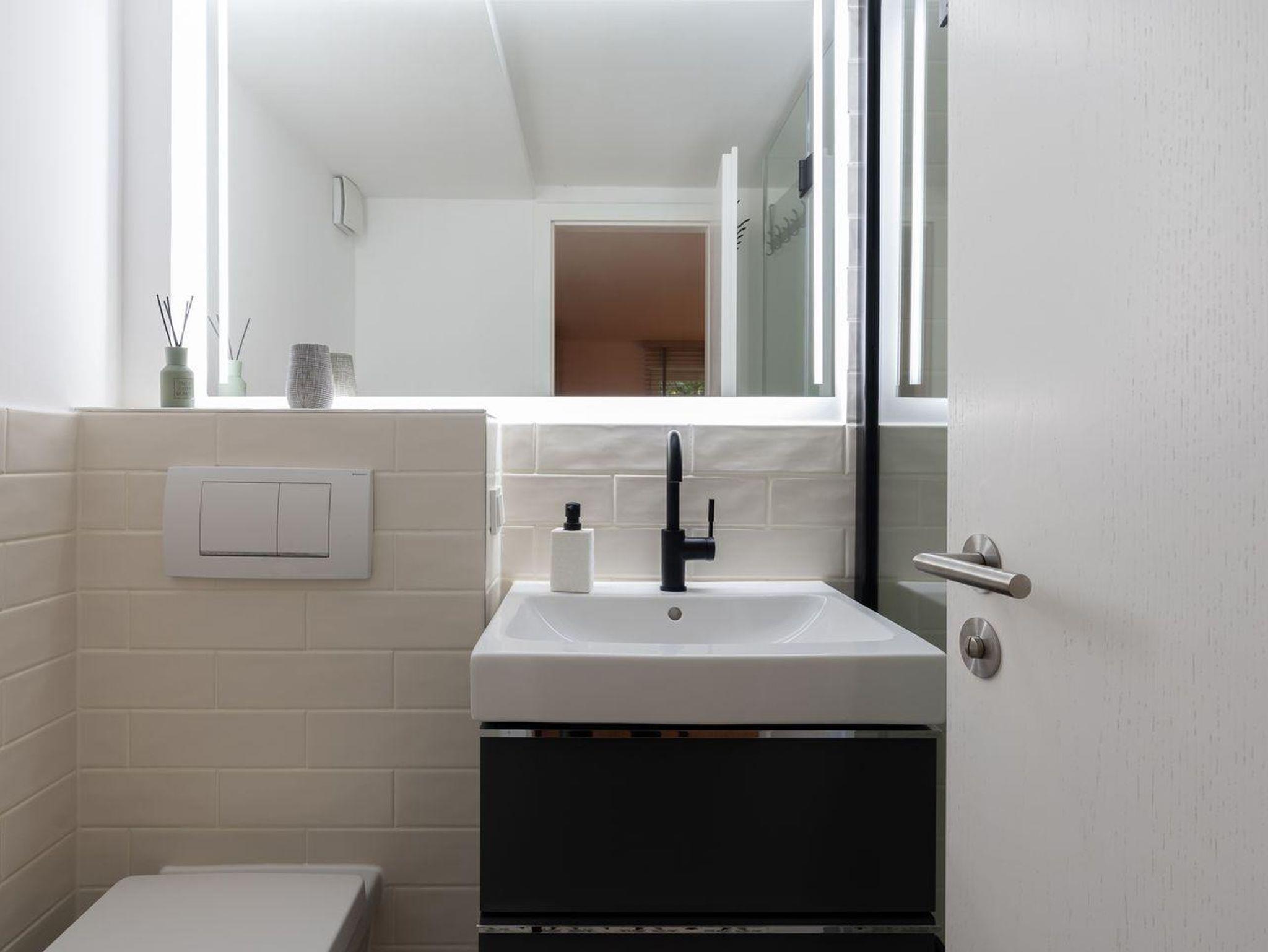 Das erste Schlafzimmer von zwei verfügt über ein komfortables Doppelbett (180x200cm) mit Kleiderschrank. Das elegante Badezimmer beeindruckt mit einer modernen bodengleichen Regen-Dusche, WC und einem Föhn für Ihren Komfort.