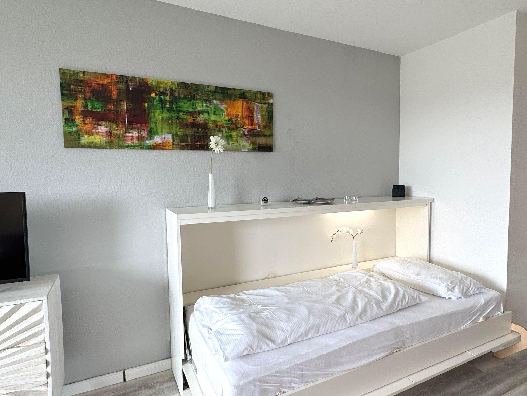 Eingangsbereich mit Garderobe, offener Wohnraum mit Essbereich und integrierten Einbauküche, Einzelschrankbett (90x200cm, Matratze ), direkter Zugang zur Südloggia mit Gartenmöbeln, von hier haben Sie einen wunderbaren Blick, Schlafzimmer mit Doppelbett (180x200cm,getrennte Matratzen), 1 Duschbad mit WC und Waschbecken.