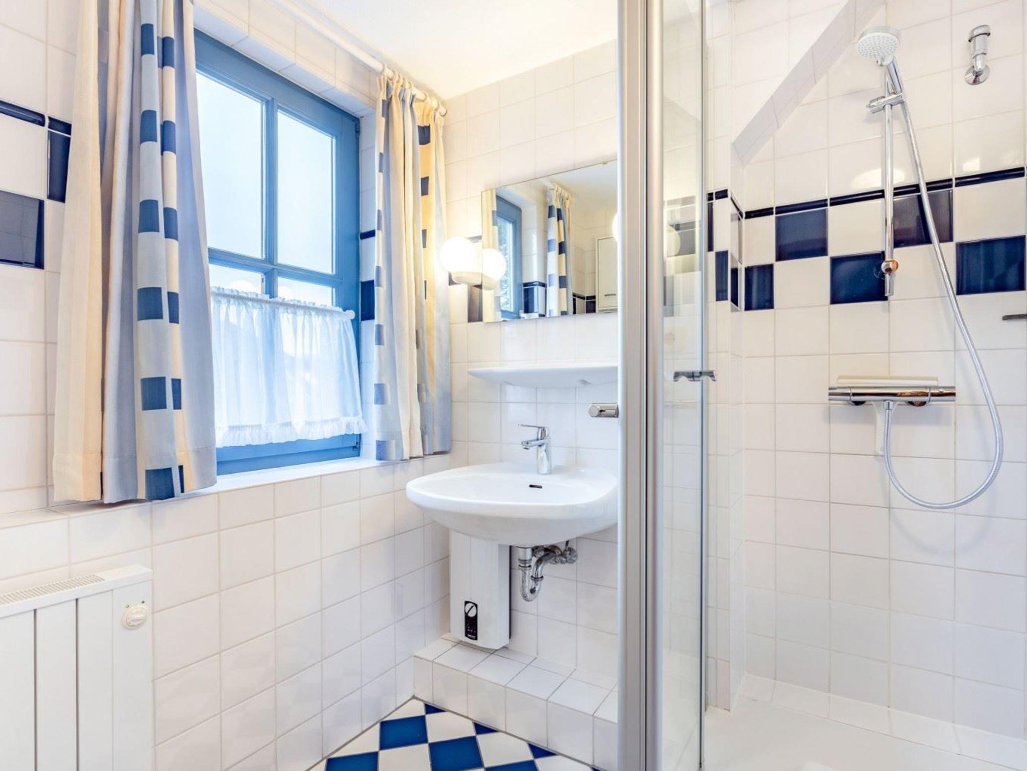 Badezimmer (Duschbad) mit Dusche, Föhn und Tageslicht. Separates WC mit Waschbecken.