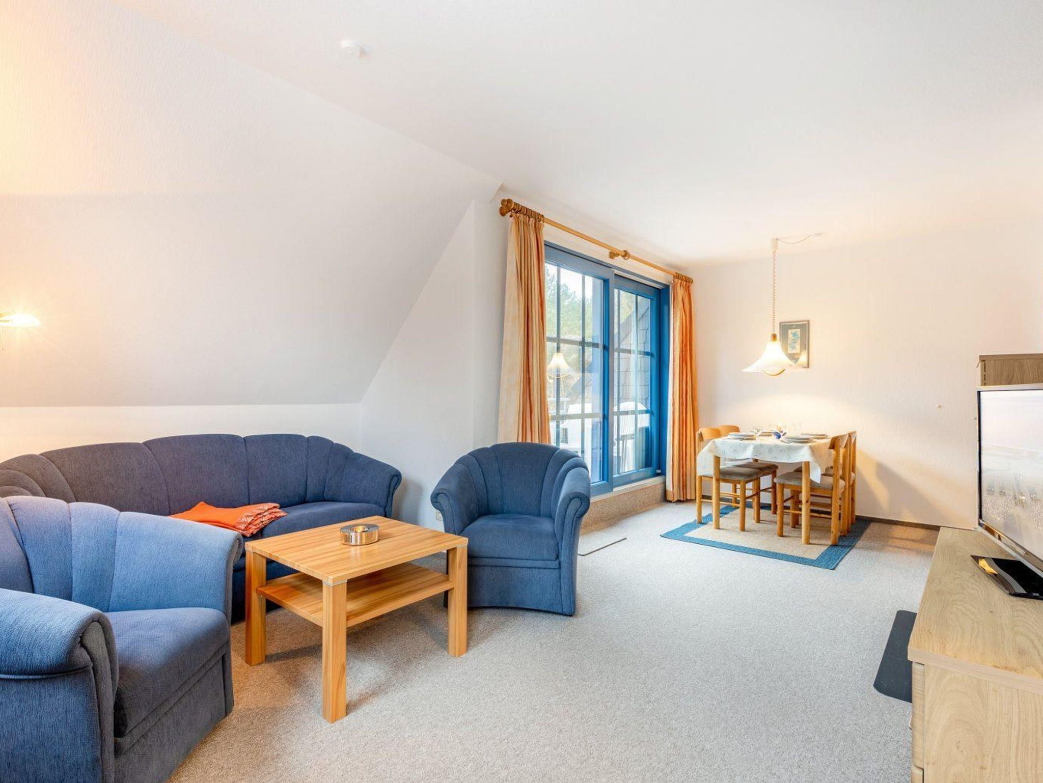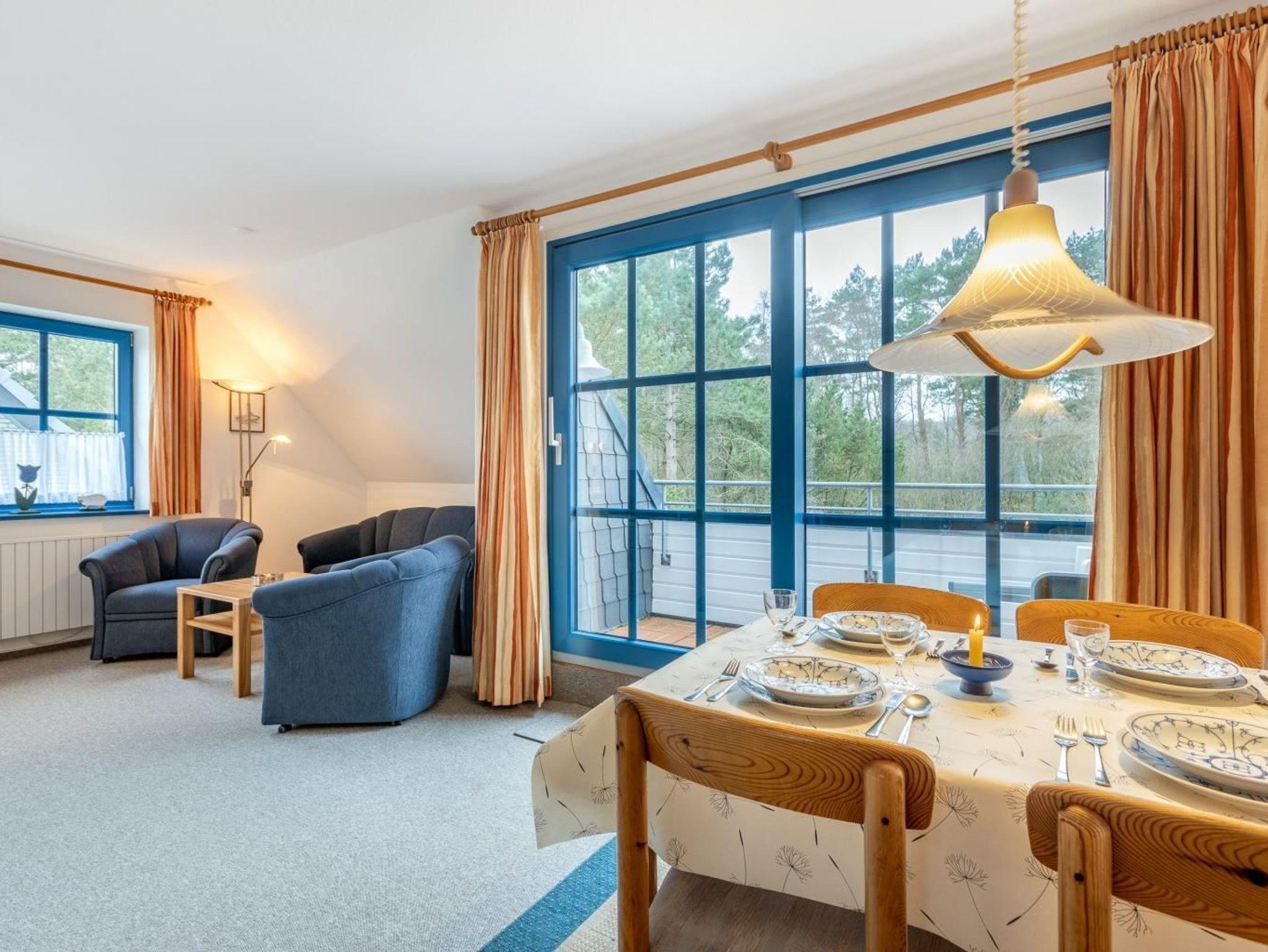 Wohnzimmer mit 1 Sofa und 2 Sesseln, TV (Kabel), Radio mit CD-Player, Esstisch mit 4 Stühlen und Kaminofen. Direkter Zugang zum möblierten, windgeschützten Balkon nach Südwesten mit schönem Ausblick auf das angrenzende Wäldchen.