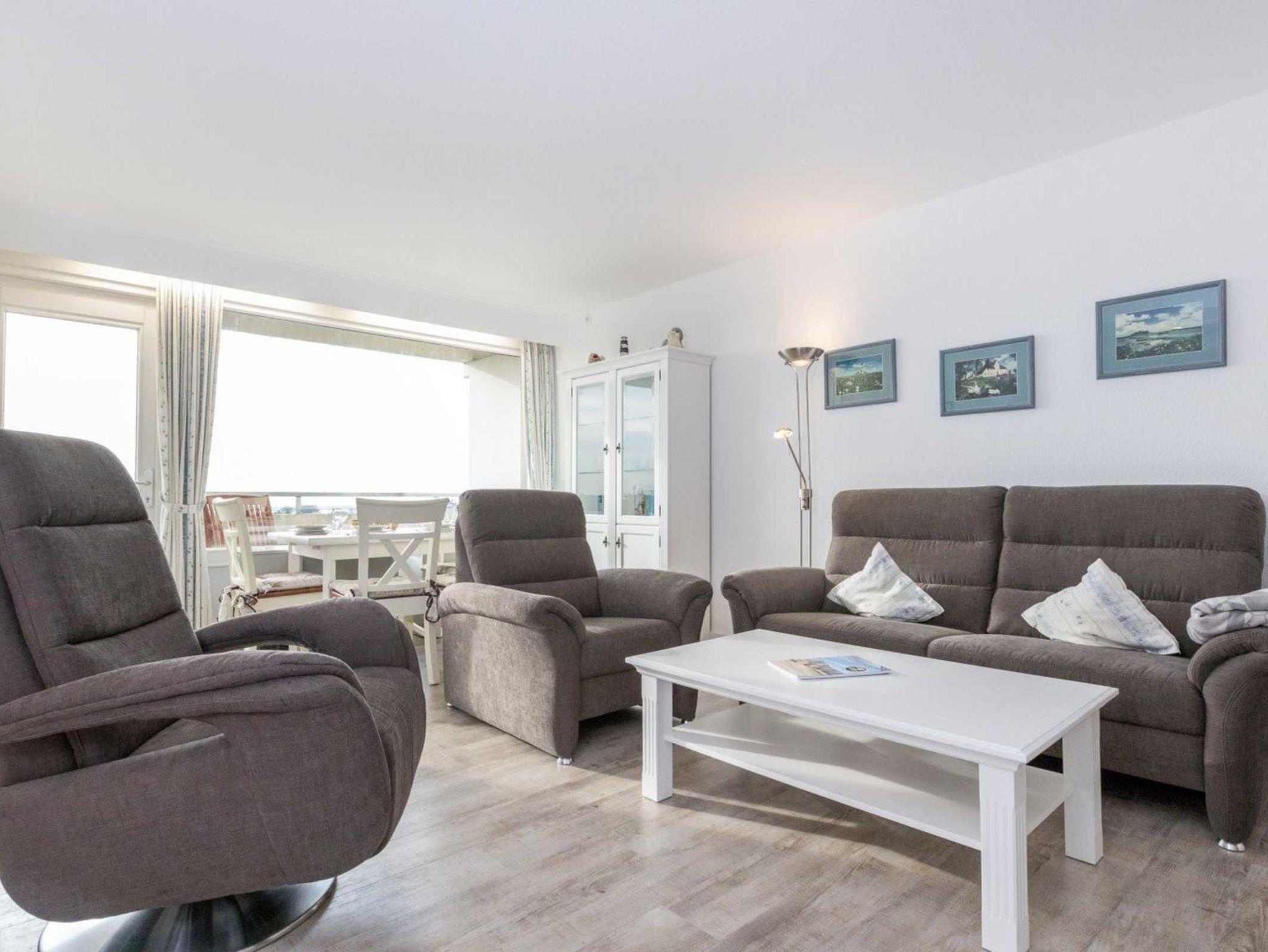 Wohnzimmer mit Sofa (3er), 2 Sesseln, Esstisch mit 4 Stühlen, TV (Sat) und Radio. Direkter Zugang zum möblierten Balkon nach Südwesten. Bei guter Sicht haben Sie einen tollen Ausblick auf den Westerhever Leuchtturm. Offene Küche mit Backofen, Mikrowelle, Geschirrsprüler und Kühlschrank ohne Gefrierfach.