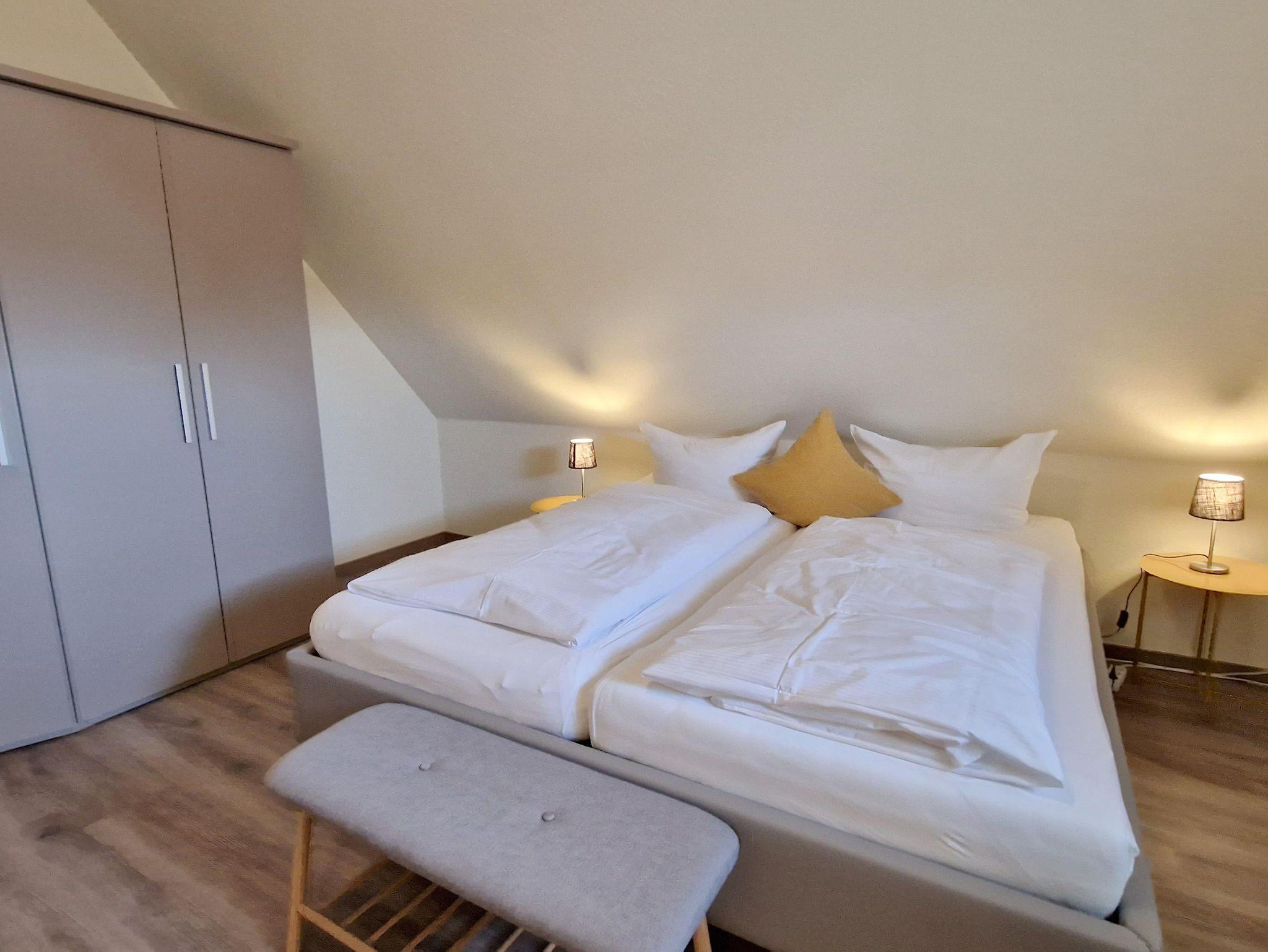 Schlafzimmer 2: 2 Einzelbetten, 2 Nachttische, Tisch, 2 Stühle, Kleiderschrank, Bügelbrett, Bügeleisen