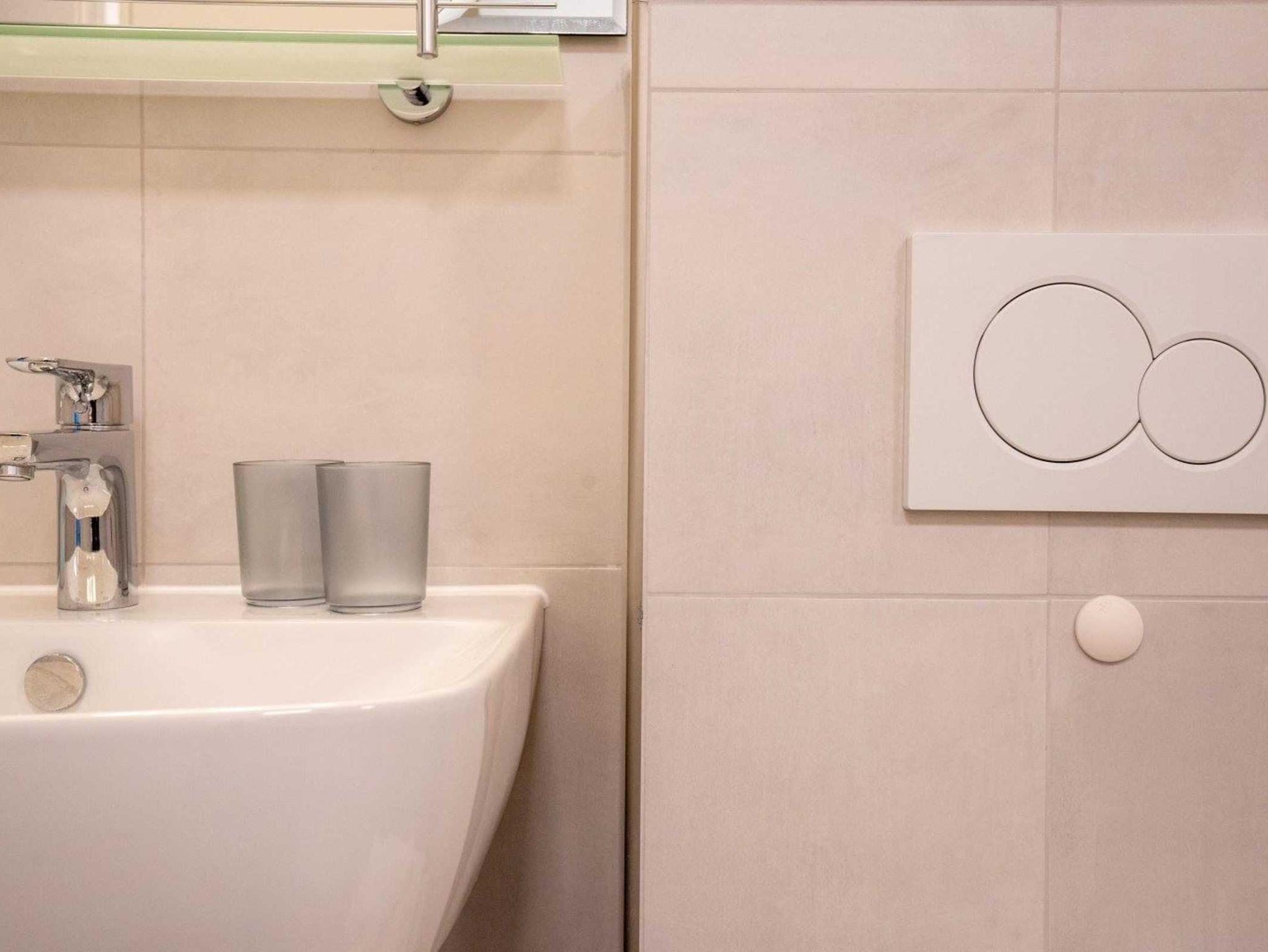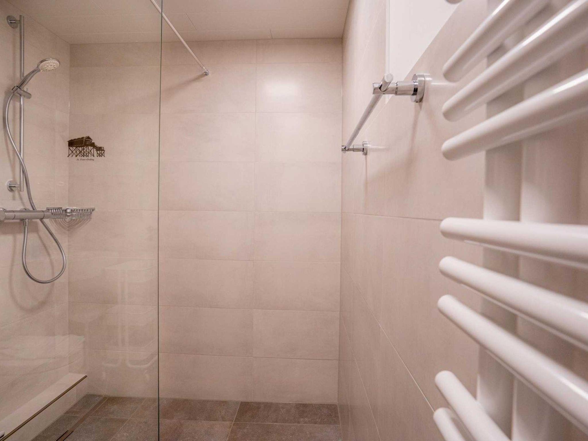 Badezimmer (Duschbad) mit bodengleicher Dusche, WC, Handtuchwärmer und Föhn.