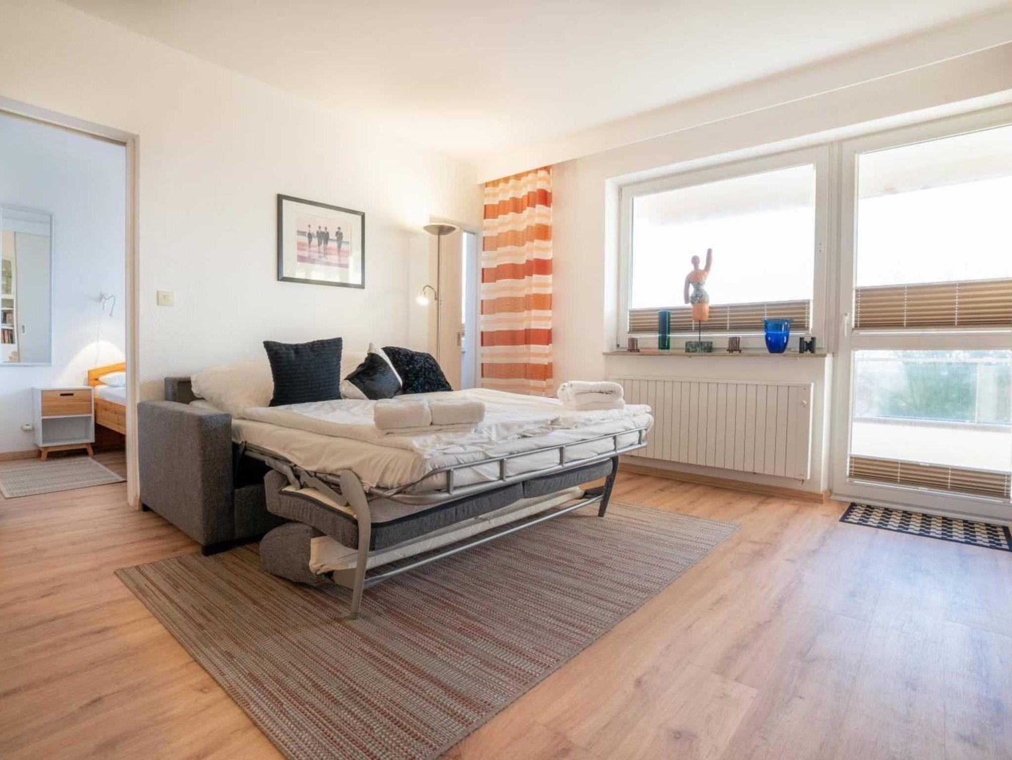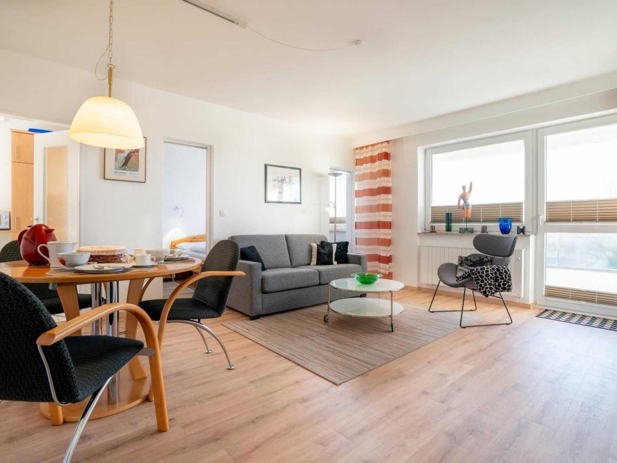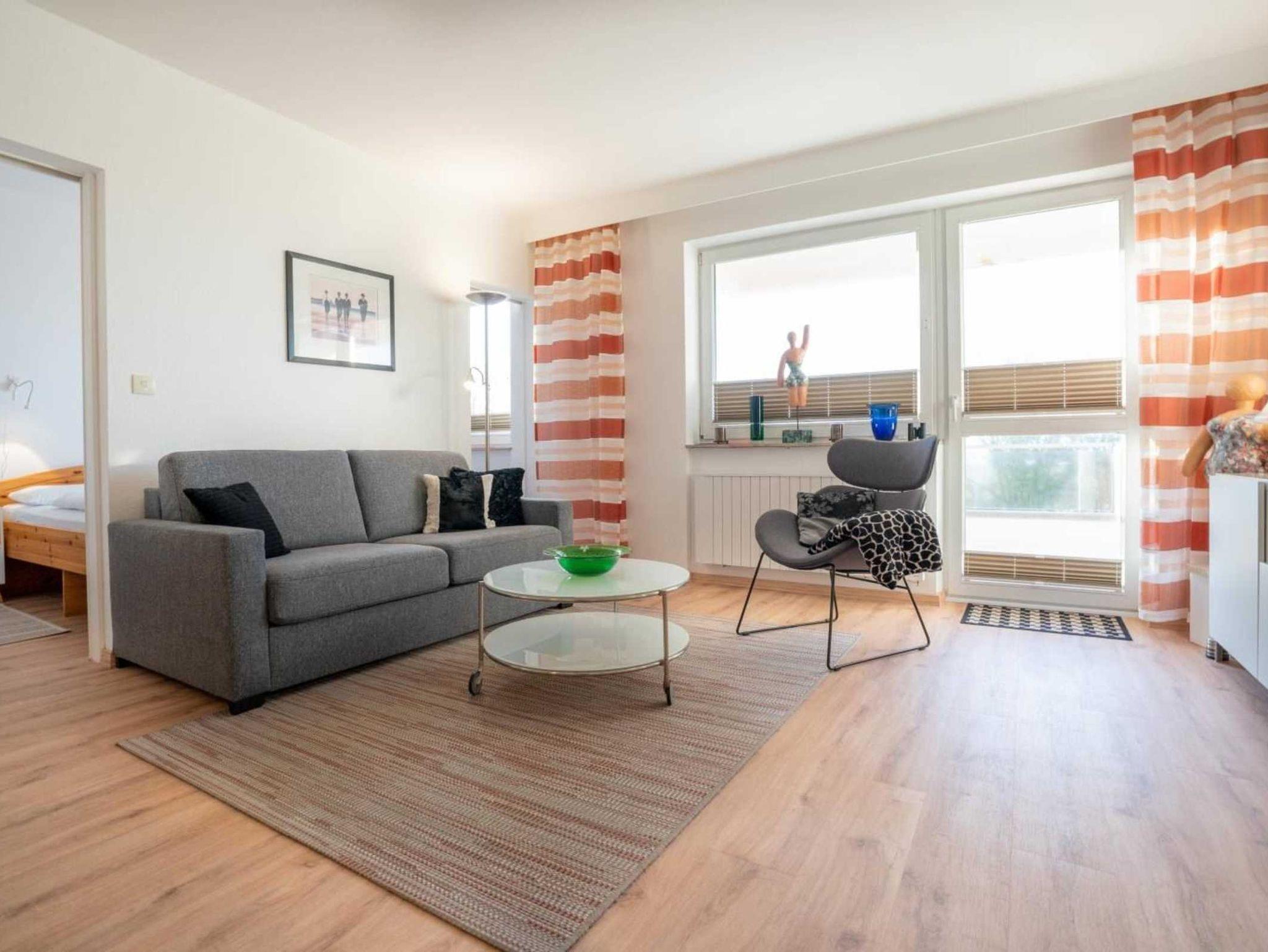 Wohnzimmer mit Schlafsofa (140x200cm), 2 Sesseln, SMART-TV (Kabel), Internet-Ratio mit Bluetooth-Funktion und Esstisch mit 4 Stühlen. Direkter Zugang zum möblierten, windgeschützten Balkon nach Südwesten.