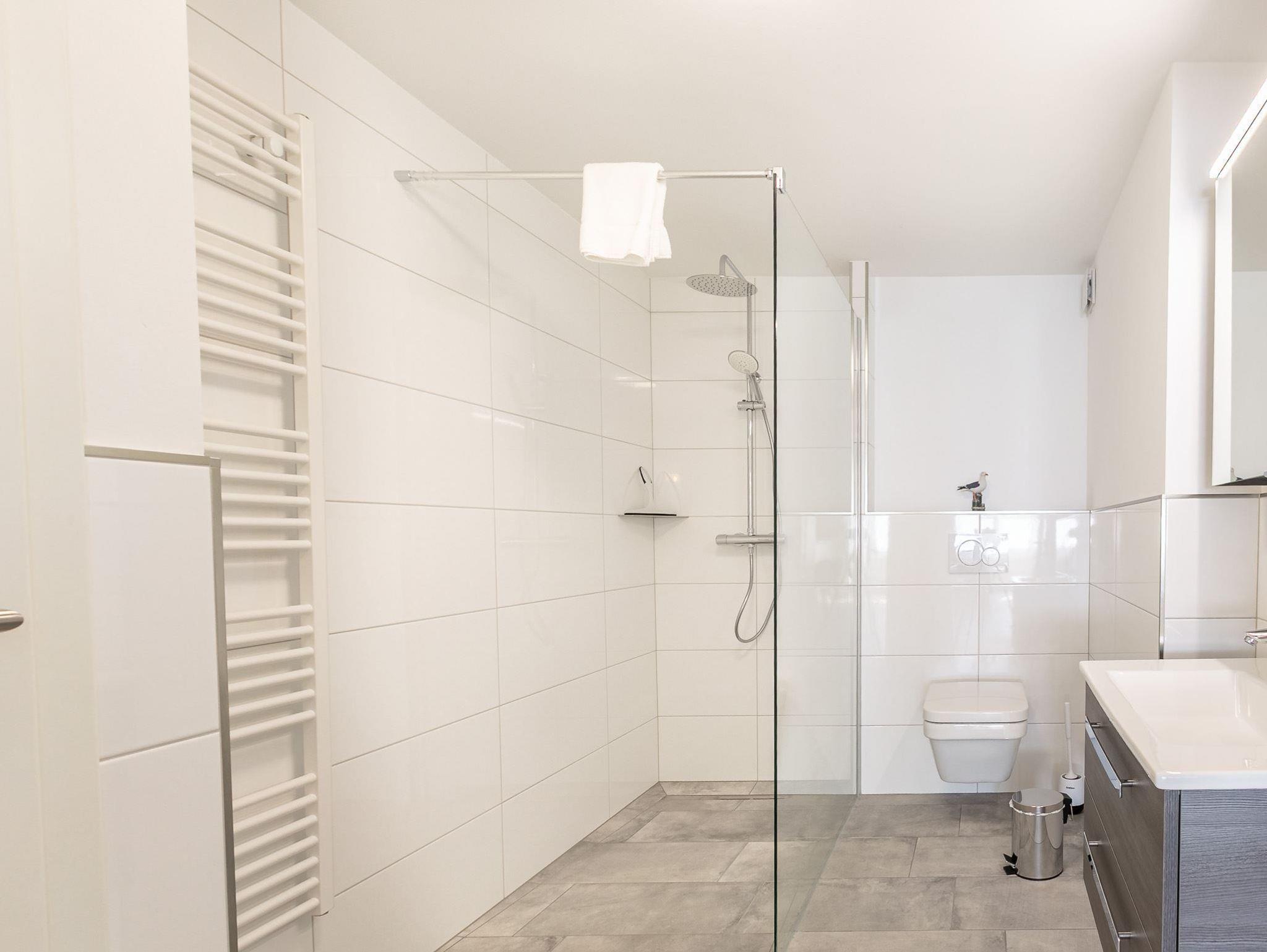 Badezimmer (Duschbad) mit bodengleicher Regen-Dusche, WC, Handtuchwärmer und Föhn.