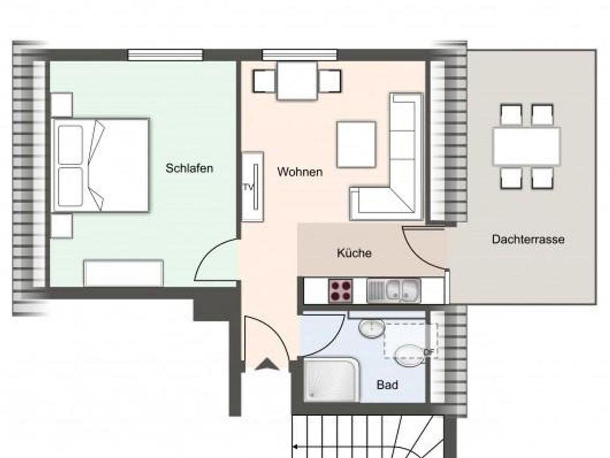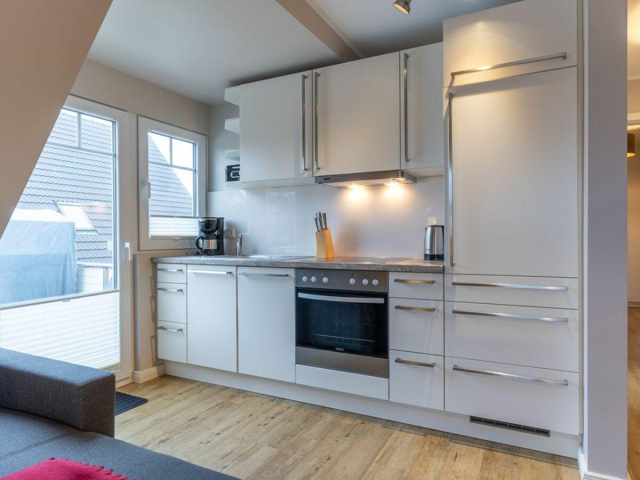 Das App. Bad im Ferienhaus Rückenwind verfügt über ca. 45 m² Wohnfläche und bietet Platz für 1-3 Personen. Die Wohnung befindet sich im Obergeschoss mit einem großzügige Wohnraum mit TV und einer modernen Wohnküche. Die Wohnräume sind mit neuen und modernen Möbeln ausgestattet. An den Wohnbereich schließen sich ein Duschbad, sowie ein Schlafzimmer mit einem Doppelbett (1,80 x 2,00 m) an. Zusätzlich gibt es im Wohnzimmer ein gemütliches Schlafsofa (1,40 x 2,00 m) für eine Personen. Vom Wohnzimmer gelangen Sie auf eine großzügige Dachterrasse. Hier können Sie wunderbar entspannen und die Seele baumeln lassen.