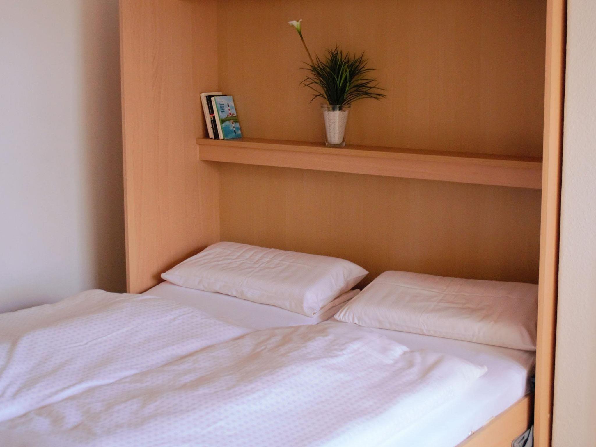 Eingangsbereich mit Garderobe, offener Wohn-und Essraum und integrierter Einbauküche, vorgelagerten Wintergarten mit direktem Zugang zur Südterrasse und Garten. Schlafzimmer mit Doppelbett (180x200cm, getrennte Matratzen), zusätzlich ein Schrankbett im Wohnraum (180x200cm, Matratze nicht durchgehend) , 1 Duschbad mit WC und Waschbecken. Parkplatz und Fahrradständer.