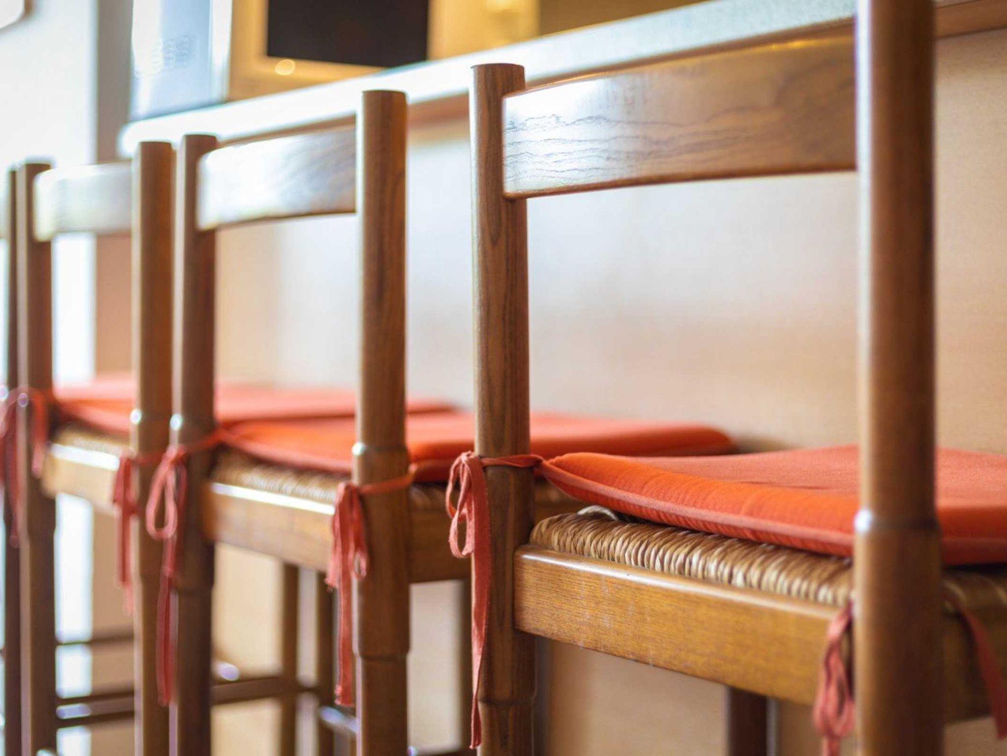 Wohnzimmer mit Sofa für 3 Personen, 2 Sesseln, TV (Sat) und Esstisch mit 4 Stühlen. Direkter Zugang zum möblierten Balkon nach Westen mit herrlichem Ausblick über den Wald. Halboffene Küche mit Backofen, Kühlschrank mit Gefrierfach, Mikrowelle, Haushaltsschrank mit Staubsauger und Tresen zum Wohnbereich mit 4 Barstühlen.