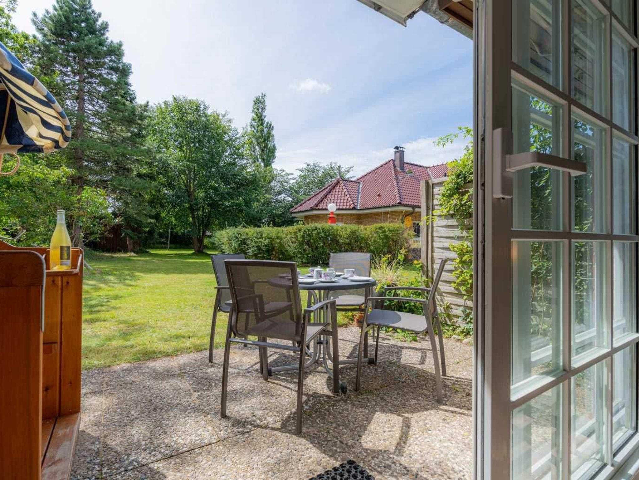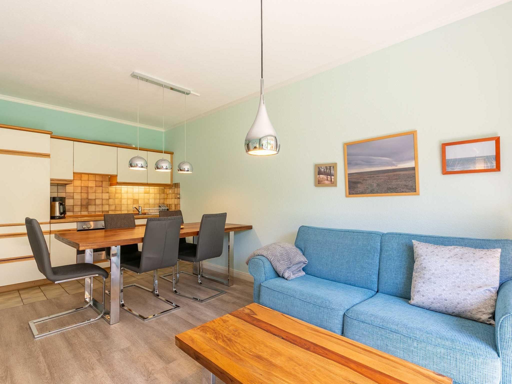 Elegant eingerichtetes Wohnzimmer mit ausziehbarem Schlafsofa (130x190cm), TV (Kabel), Radio und Esstisch mit 5 Stühlen. Direkter Zugang zum möblierten Gartenterrasse nach Süden mit Strandkorb. Offene Küche mit Backofen, Kühlschrank (ohne Gefrierfach) und Geschirrspüler.