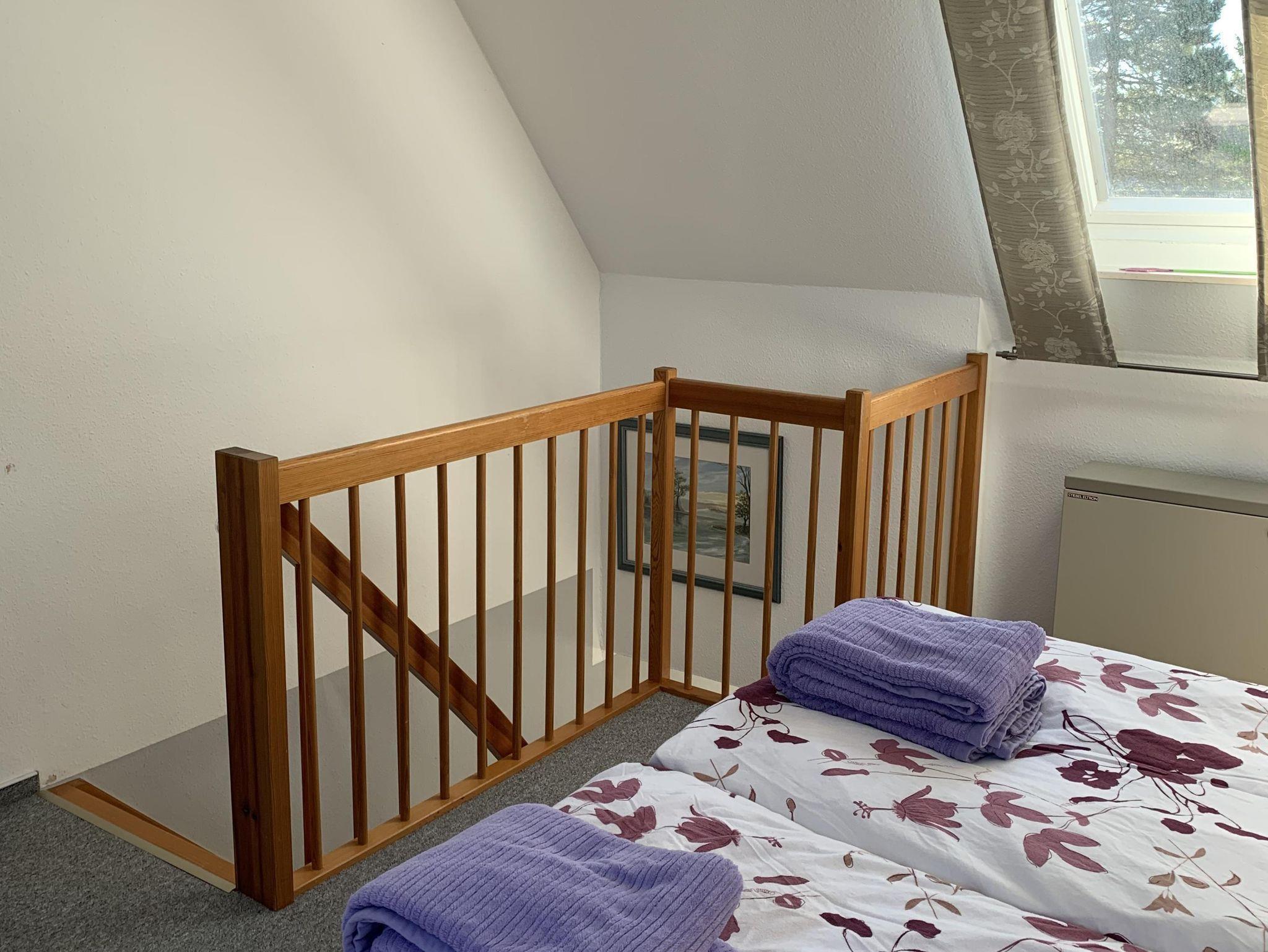 Das Schlafzimmer mit Doppelbett befindet sich auf der Schlafgalerie. Bei Ihrer Ankunft sind die Betten für Sie bezogen und frische Handtücher liegen bereit.