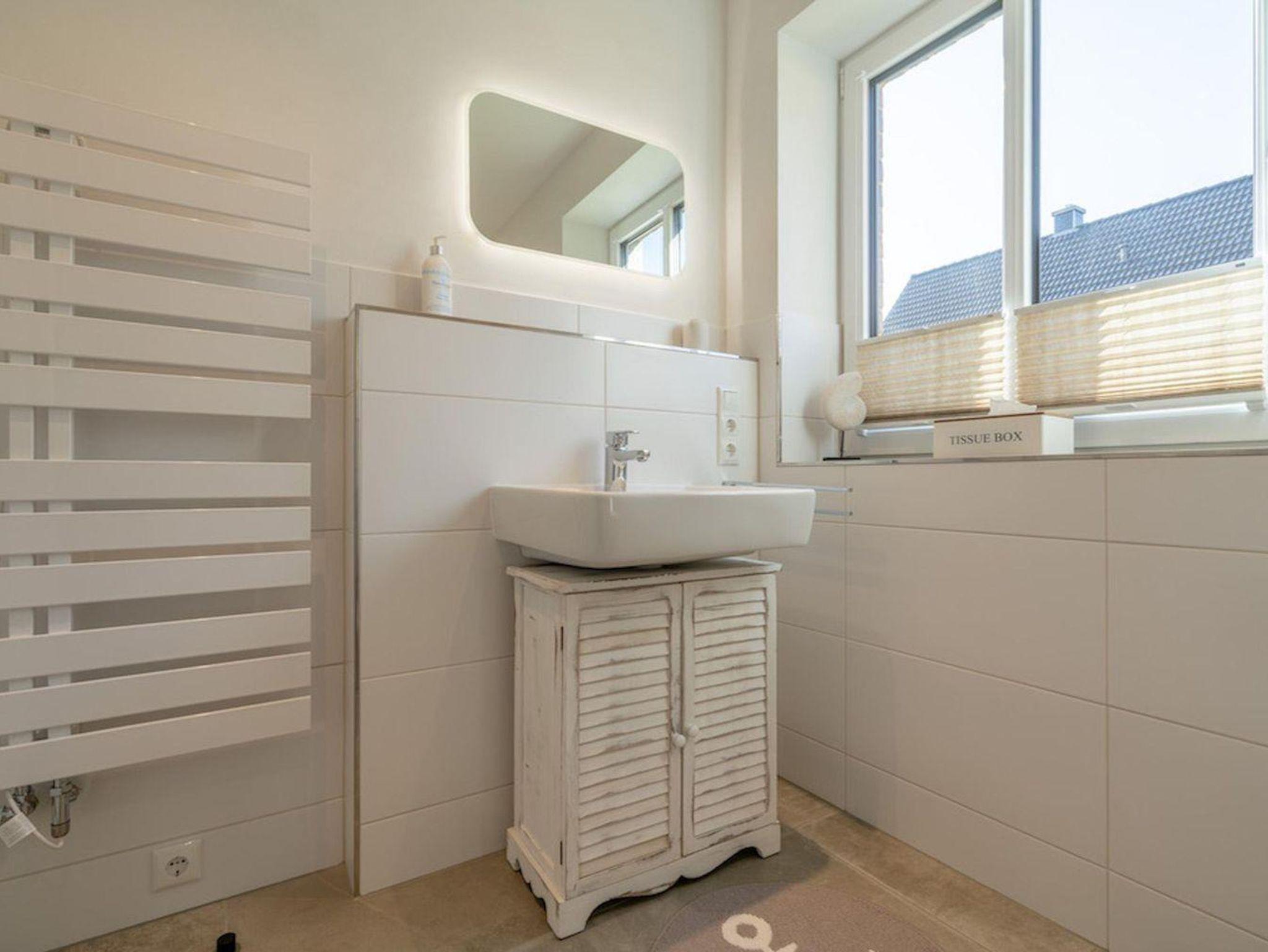 Im Empfangsgereicht ist ein Flur mit Garderobe, von hier aus gelangt man in das Obergeschoss. Hier befindet sich ein Schlafzimmer mit einem Doppelbett und ein Doppelschlafzimmer mit 2 Einzelbetten. Große Fenster sorgen für viel Licht, in diesem Haus kann der Sonnenauf- bzw. untergang genossen werden. Außerdem ist im Obergeschoss ein weiteres Vollbad mit Dusche und Badewanne, sowie ein geräumiger Flur.