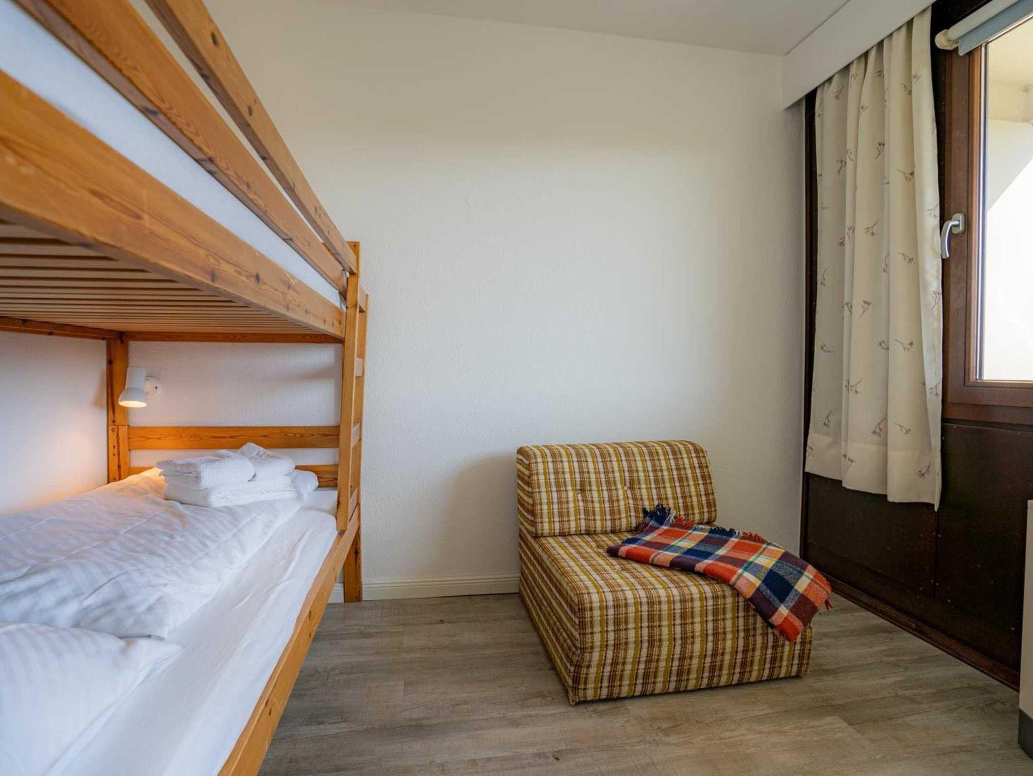 2. Schlafzimmer mit 2 Etagen-Einzelbetten (je 90x190cm), Sessel, Stuhl und Waldblick.