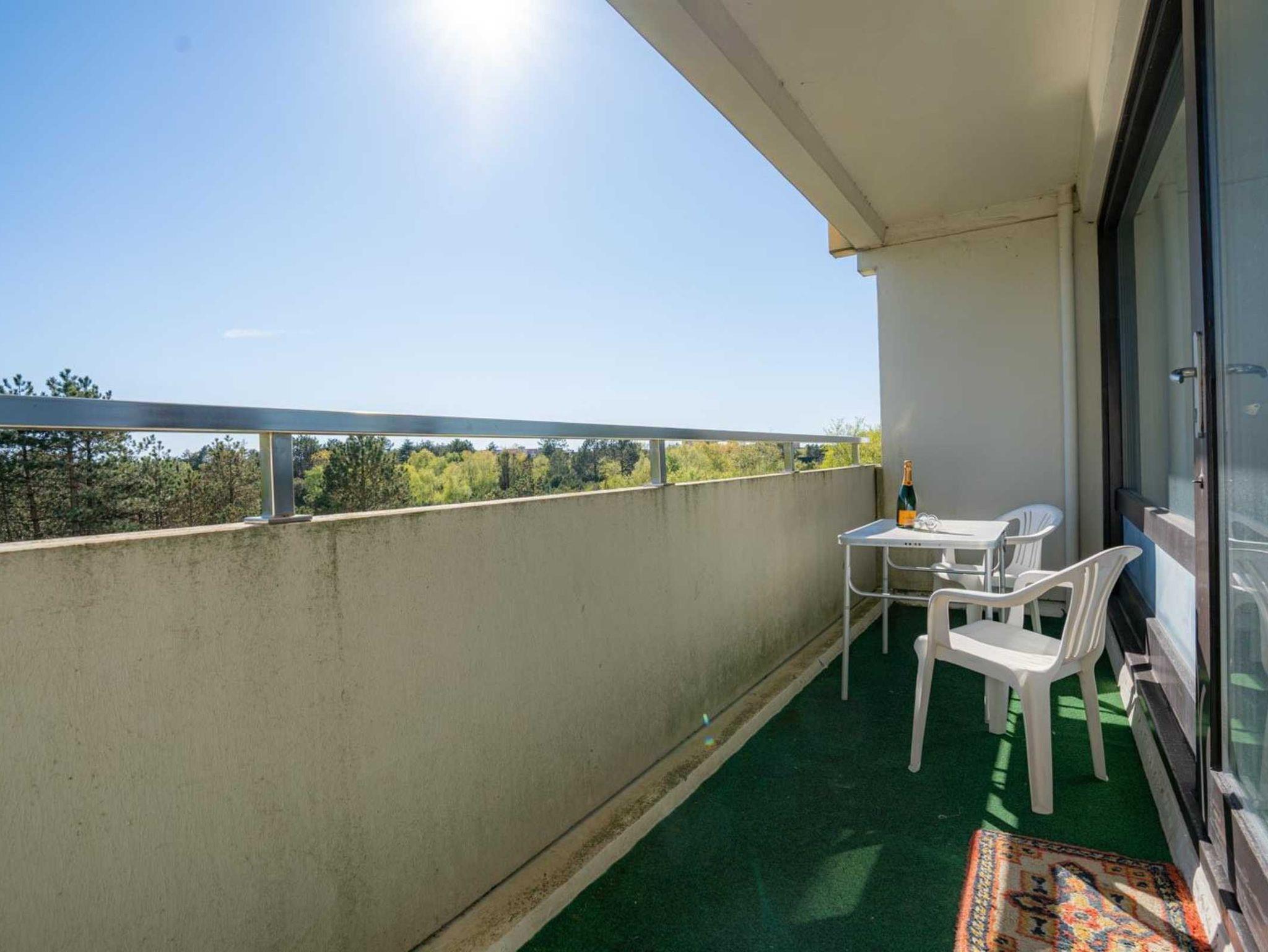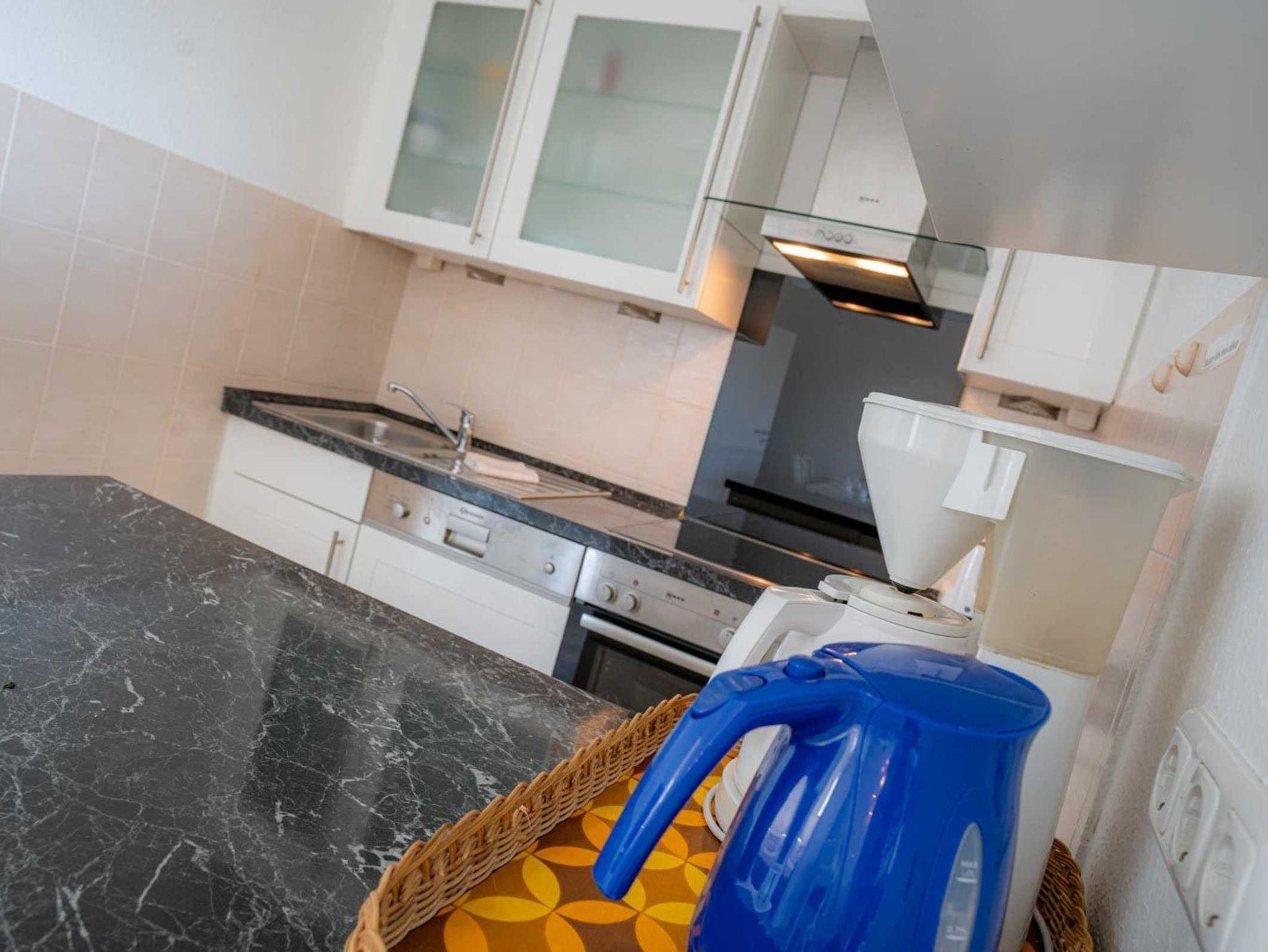 Wohnzimmer mit 2 Sofas für je 2 Personen, TV (Sat), Radio und Esstisch mit 4 Stühlen. Direkter Zugang zum möblierten Balkon nach Südwesten mit herrlichem Ausblick über den Wald. Offene Küche mit Backofen, Geschirrspüler und Kühlschrank mit Gefrierfach.
