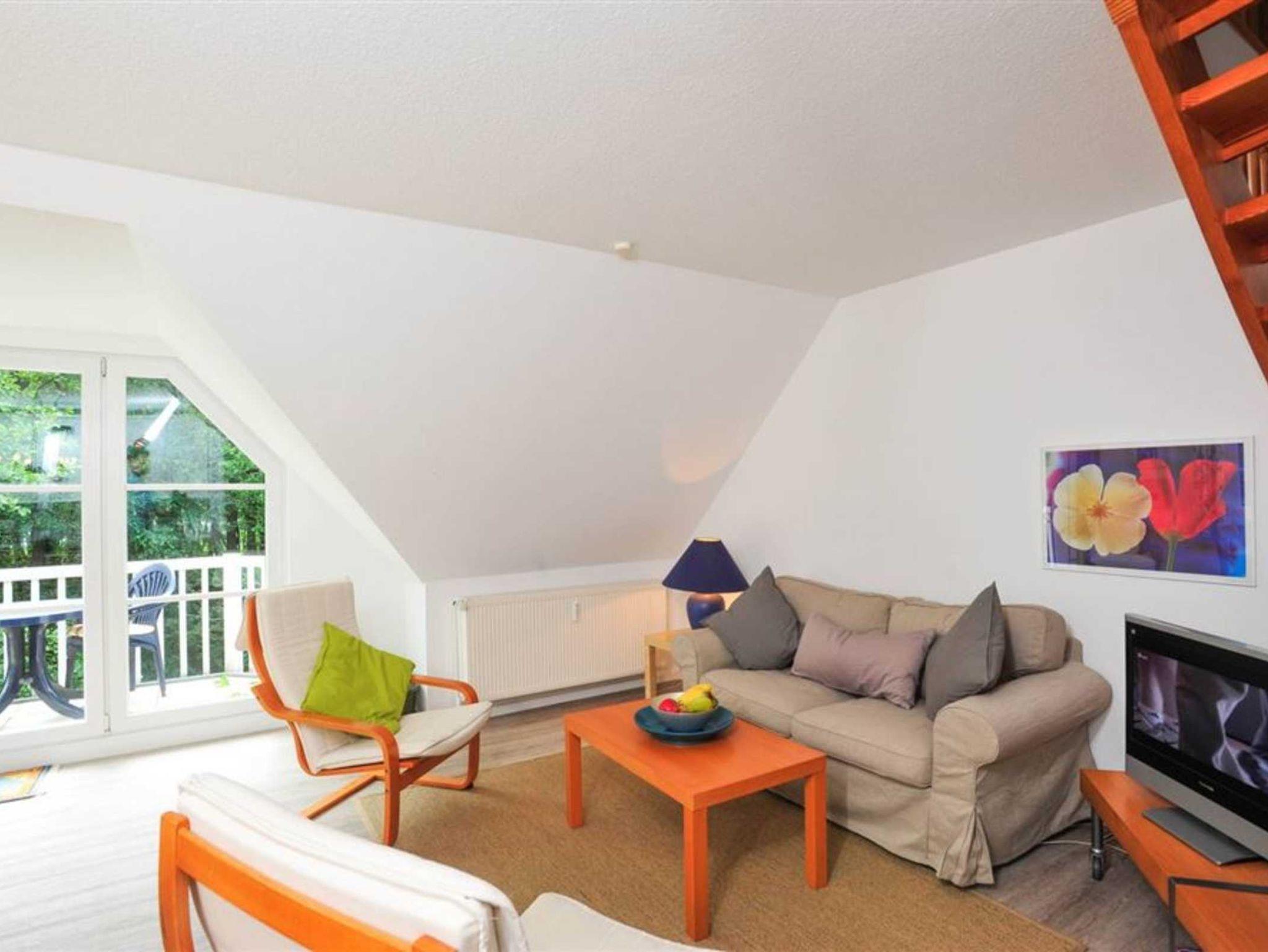 Sonniges Wohnzimmer mit Sofa (2er), 3 Sesseln, TV (Kabel) und Esstisch mit 4 Stühlen. Direkter Zugang zum möblierten Balkon nach Süden mit Waldblick. Offene Küche mit Backofen, Kühlschrank mit Gefrierfach und einigem Komfort.