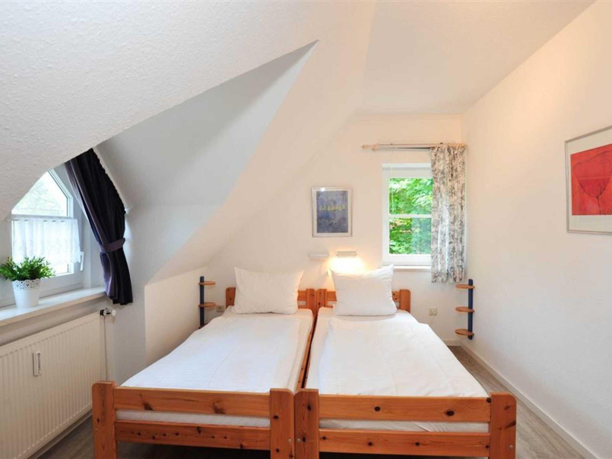 2. Schlafzimmer (halboffen) mit 2 Einzelbetten (je 90x200cm), Kommode, Tisch, 2 Sesseln und Stuhl. Zugang über eine steile Wendeltreppe vom Wohnzimmer.