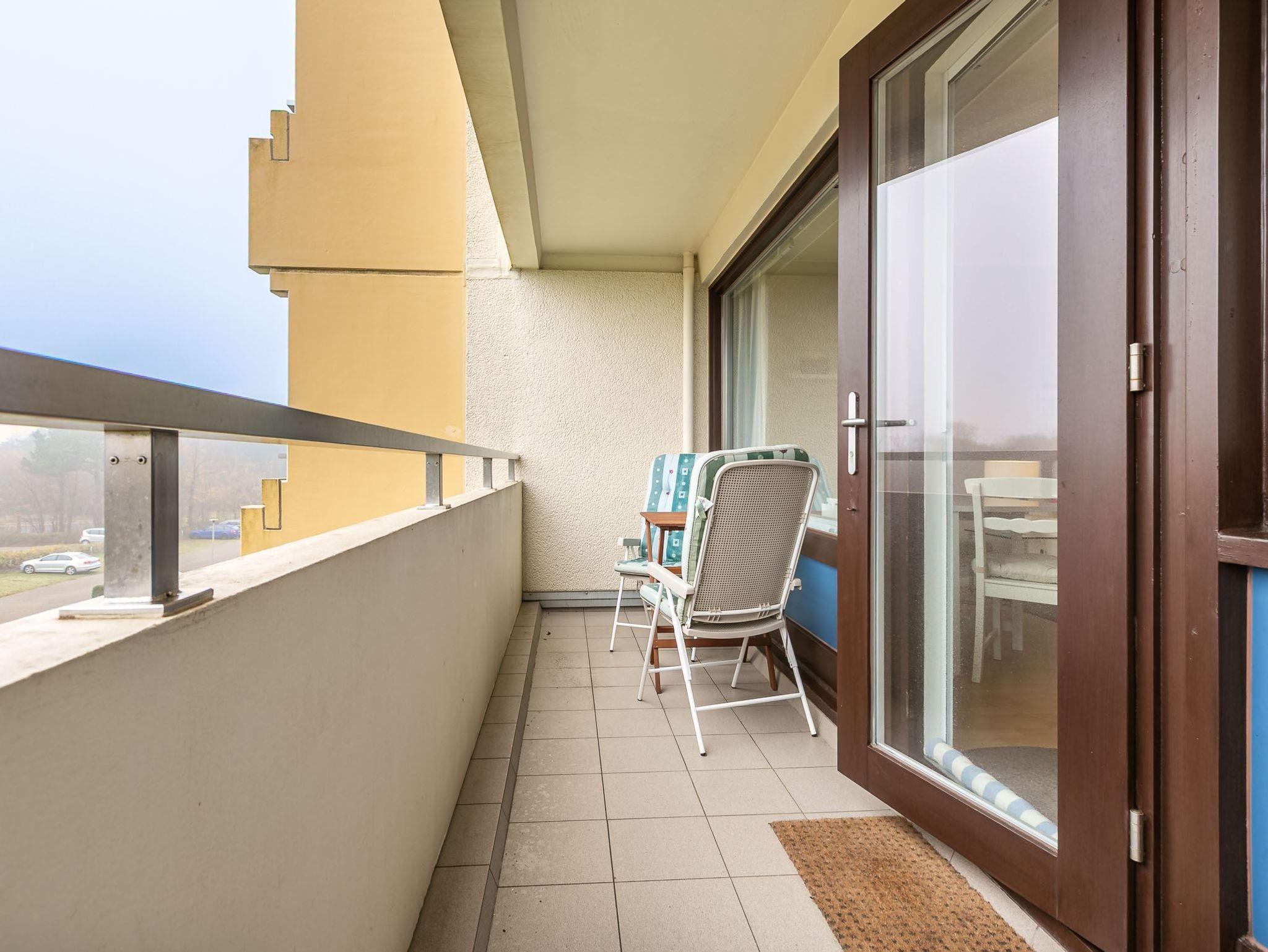 Wohnzimmer mit gemütlichem Sofa, einem sehr bequemen Ruhesessel, TV (Sat) mit DVD-Player und ausklappbarem Esstisch für 2-3 Personen. Direkter Zugang zum breiten, möblierten Balkon nach Westen mit Blick auf den Tennisplatz und Dünengürtel. Halboffene Küche mit Backofen, Mikrowelle, Geschirrspüler und Kühlschrank mit Gefrierfach. Die Küche ist durch einen praktischen Tresen mit zwei Hochstühlen vom Wohnzimmer abgeteilt.