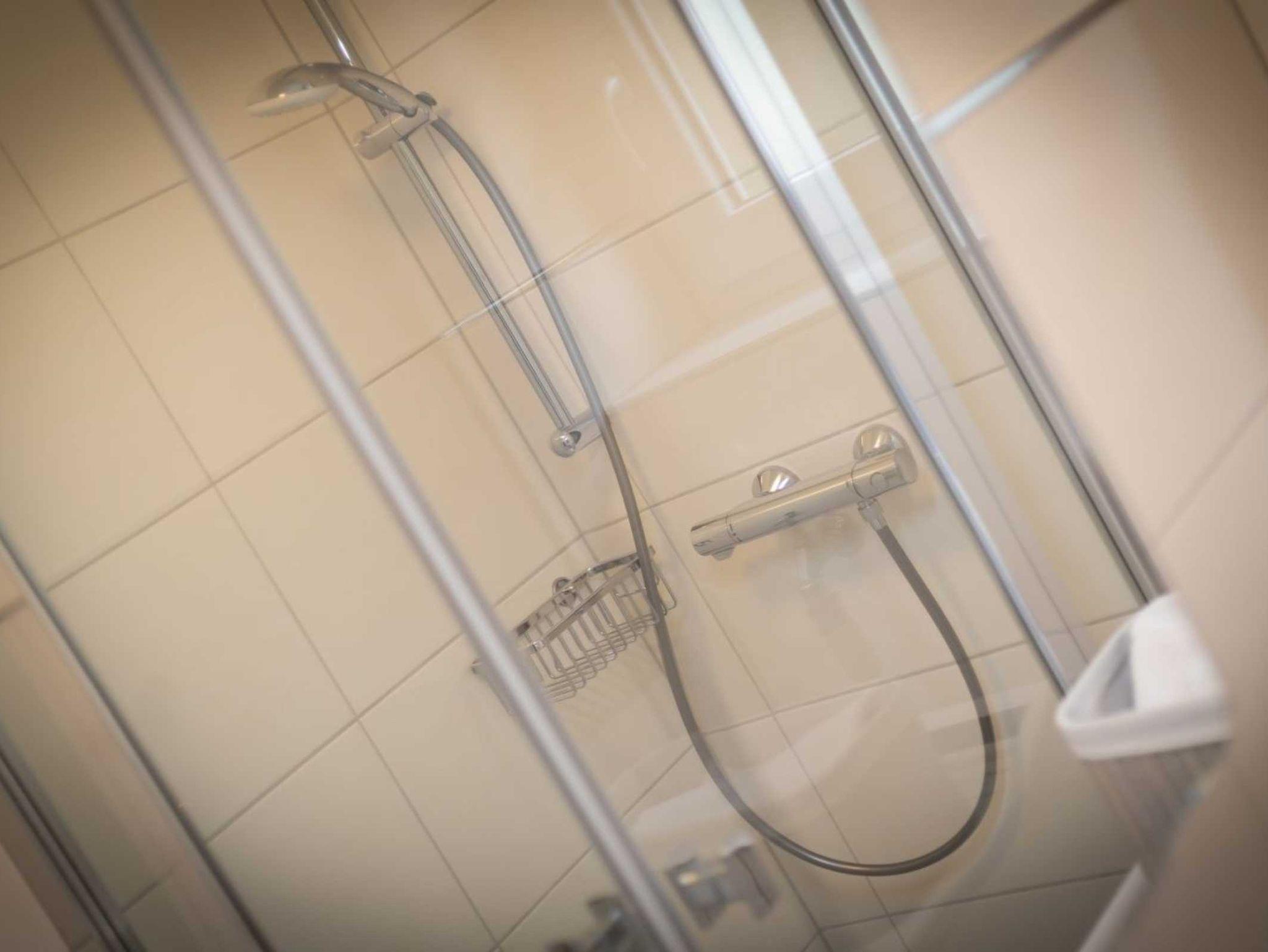 Badezimmer (Duschbad) mit Dusche, WC, Waschmaschine, Handtuchwärmer und Tageslicht.