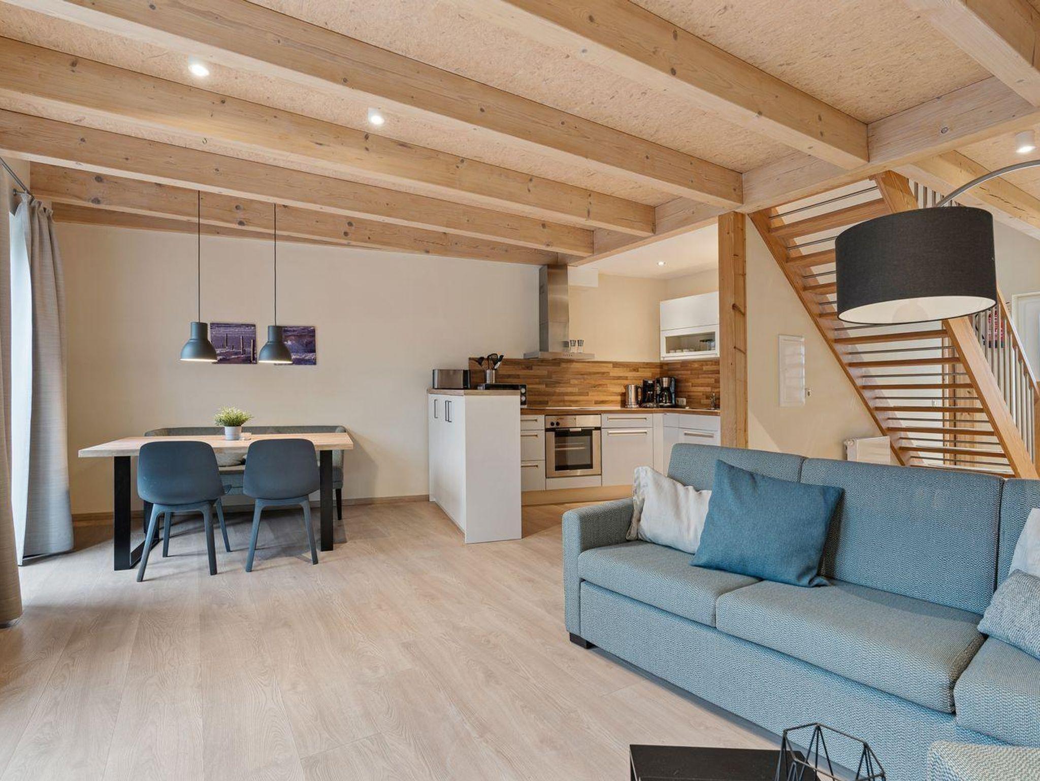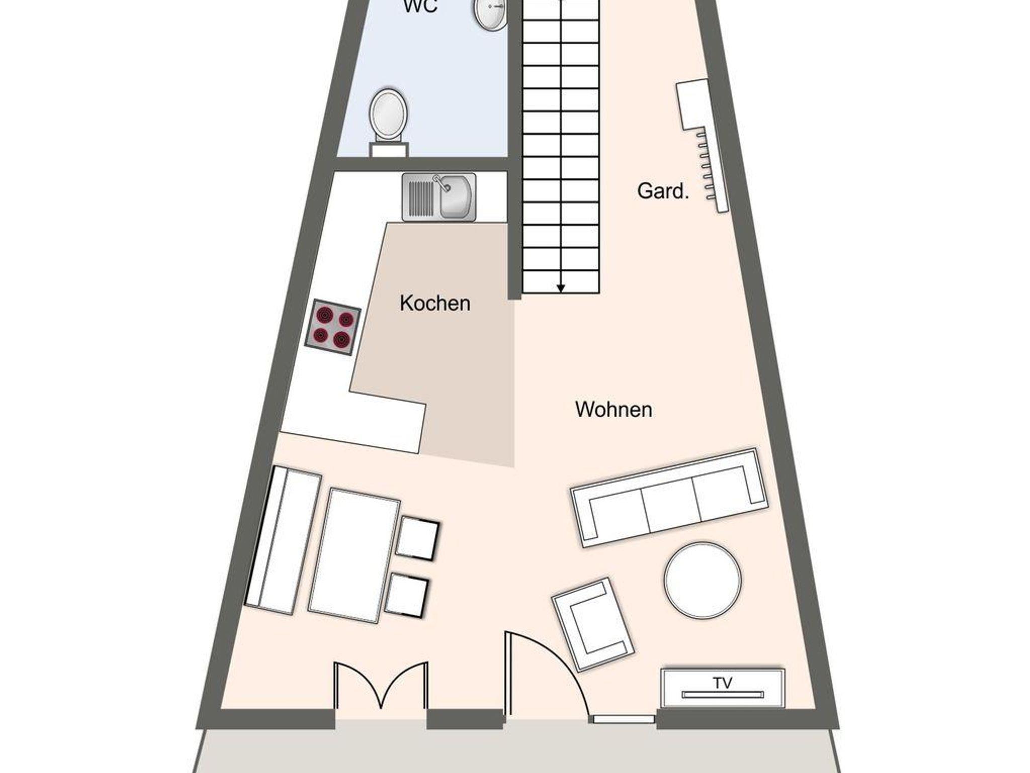 Im Erdgeschoss befindet sich ein großzügiger Wohnraum mit TV und einer modernen Wohnküche. Die Küche verfügt über hochwertige Elektrogeräte, eine Pad-Kaffeemaschine und eine Filter- Kaffeemaschine.