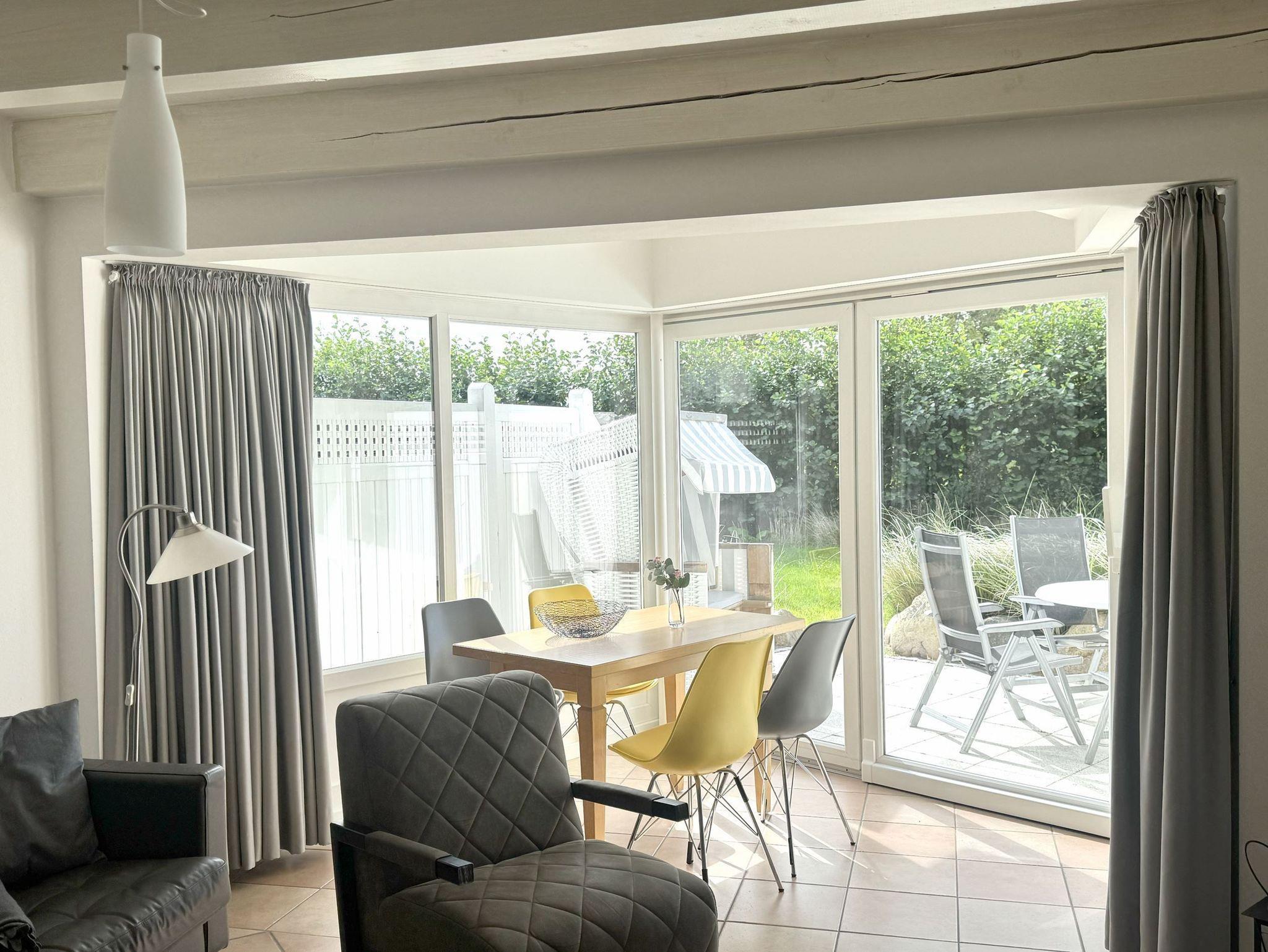 Im Haus Luna II befindet sich die Luna Wohnung 17. Mit einer Größe von 75qm bietet sie ausreichend Platz für bis zu 4 Personen. Durch ihre Bodenbeläge, Designerparkett und/oder Fliesen, ist die Wohnung für Allergiker geeignet. Von der mit einer Garderobe ausgestatteten Eingangsdiele aus führt eine gradläufige Treppe in das Obergeschoss der Wohnung. Hier befinden sich zwei Schlafzimmer. Das eine ist mit einem Doppelbett (180x200cm, getrennte Matratzen) und das andere ist mit zwei Einzelbetten (90x200cm) ausgestattet. Das Zustellen eines Kinderreisebettes ist räumlich kein Problem. Ein solches kann auch mitgebucht werden. Abgehend von der Eingangsdiele im Erdgeschoss betreten Sie einen großzügigen Wohn-Essraum mit voll ausgestatteter Küchenzeile, gemütlicher Sitzecke mit Fernseher und einem Essbereich. Sie haben kostenlosen Zugriff auf das WLAN. Das moderne Duschbad verfügt über eine begehbare Dusche, WC und Waschbecken sowie ein Außenfenster. Der raumhoch verglaste Wintergarten sorgt für eine angenehme Helligkeit im gesamten Wohn-Essbereich und ermöglicht einen wunderschönen Blick in den Garten. Ebenerdig betreten Sie die von einer kleinen Sanddüne eingefasste Südterrasse. Hier lässt es sich auf den Gartenmöbeln an frischer Nordseeluft frühstücken oder im Strandkorb ein Buch lesen.