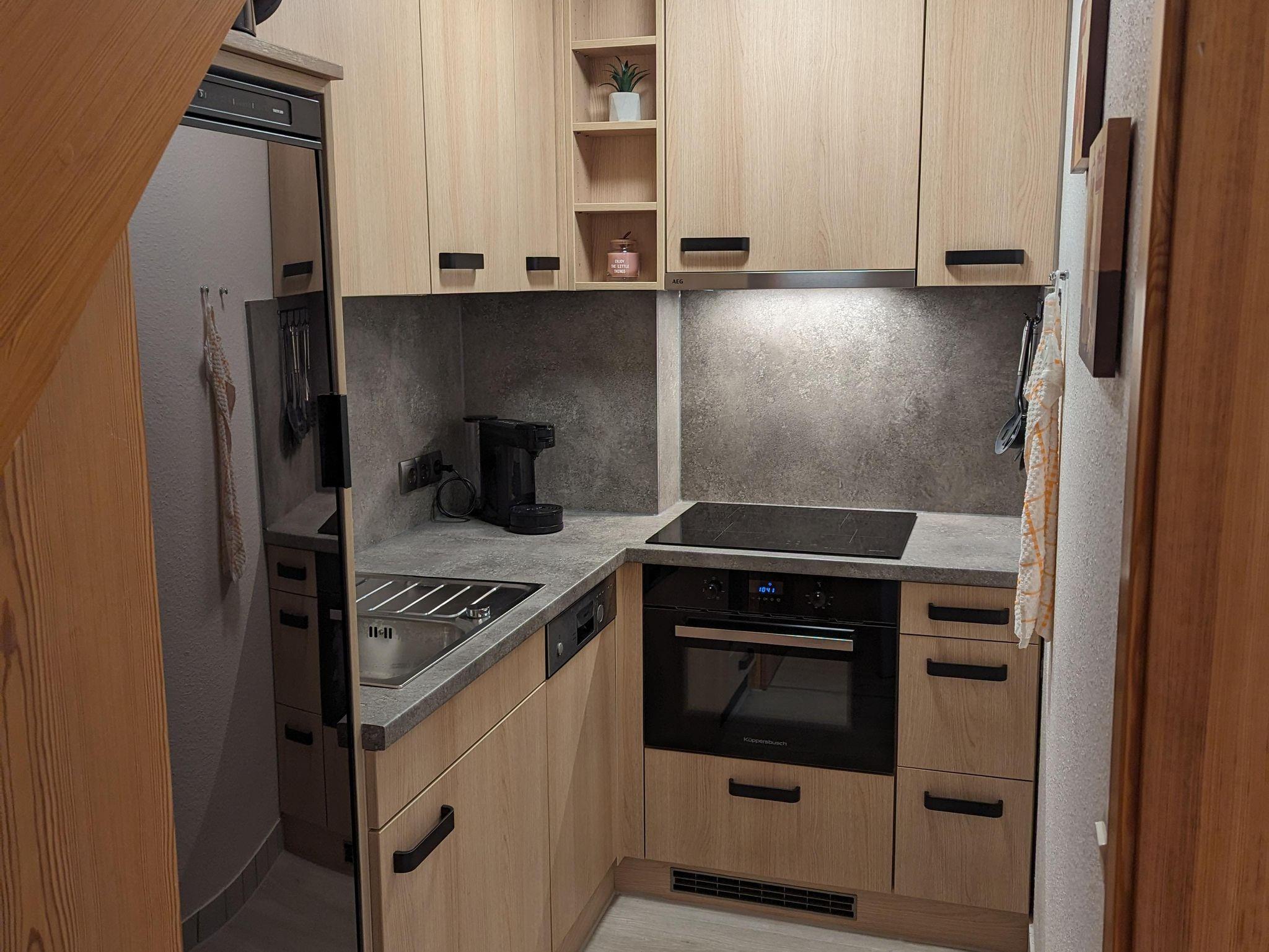 Wohnzimmer mit großem Ecksofa, TV (Kabel), Internet-Radio mit USB-Anschluss und Esstisch mit 5 Stühlen. Direkter Zugang zum möblierten Balkon nach Westen. Halboffene Küche mit Mikrowelle, Kühlschrank mit Gefrierfach, Geschirrspüler und Philips Senseo Switch Kapsel-Kaffeemaschine.