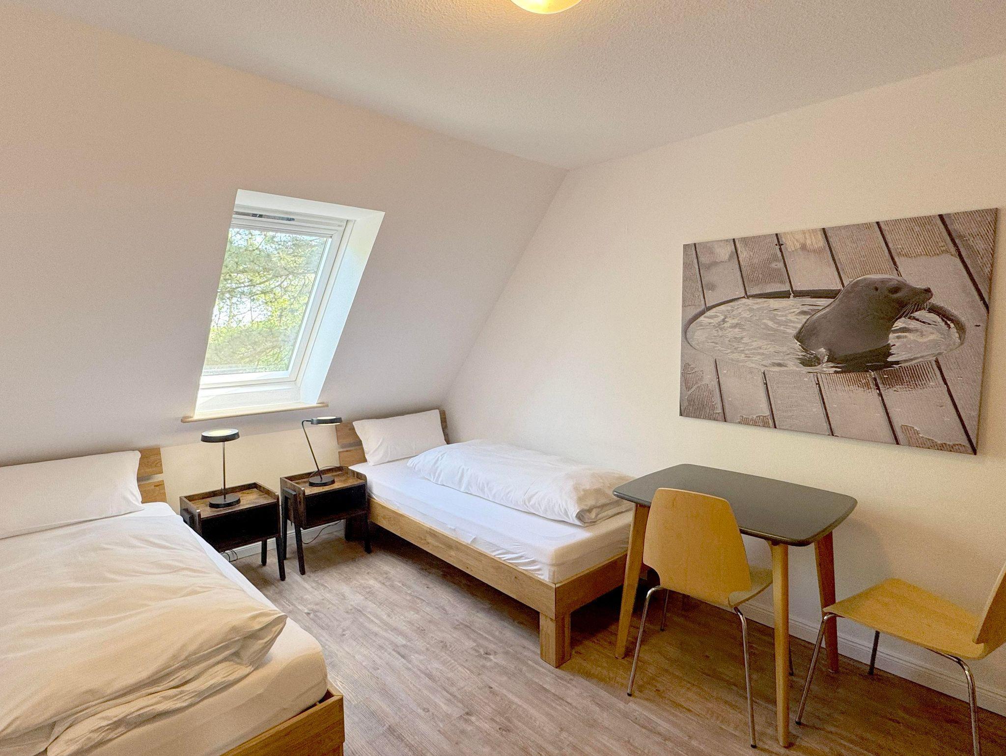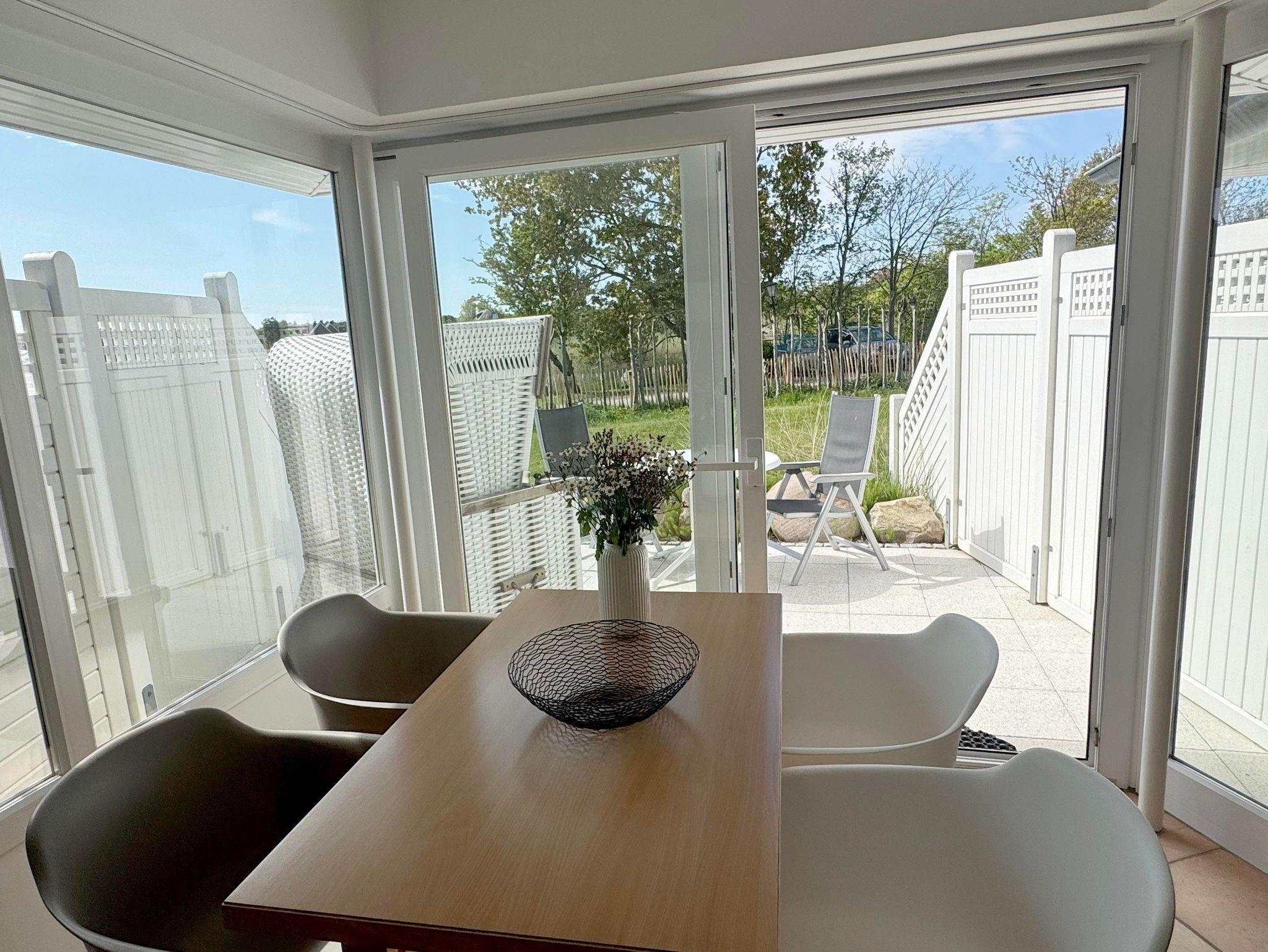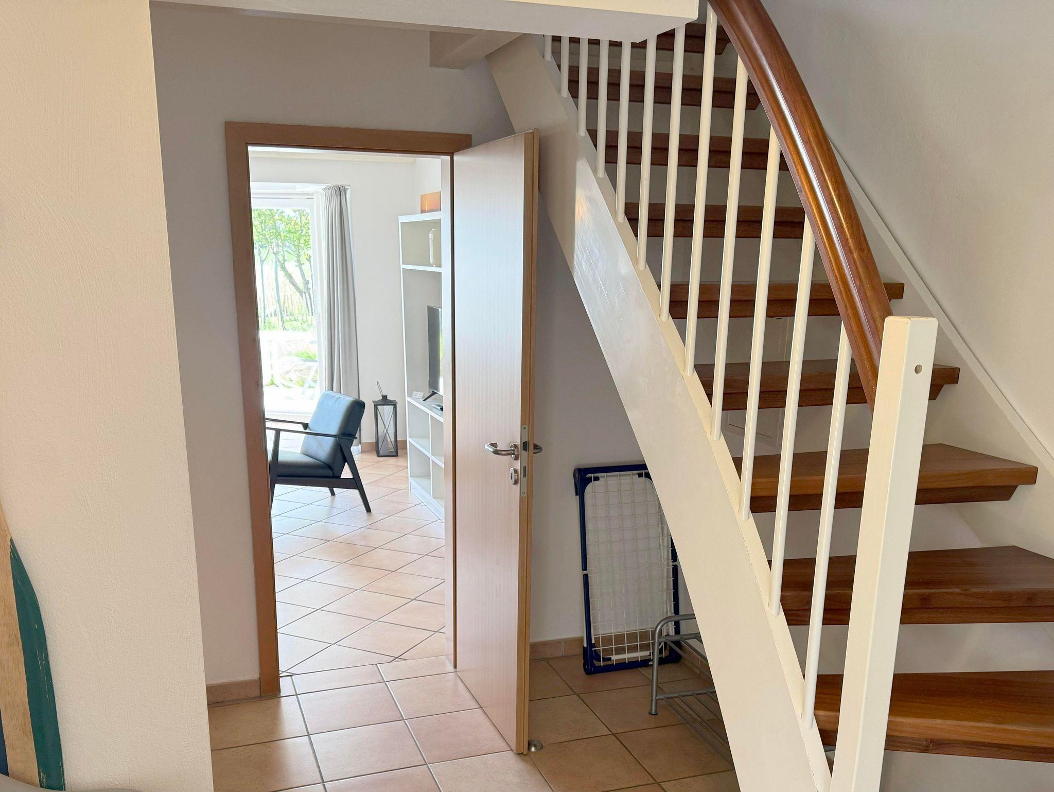 Im Erdgeschoss befindet sich die Eingangsdiele mit einer gradläufigen Treppe nach oben zu den beiden Schlafzimmern.1 Schlafraum mit Doppelbett 180x200cm mit getrennten Matratzen, ein Schlafraum mit 2 Einzelbetten (90x200cm). Das Zustellen eines Kinderreisebettes oder Hochstuhles ist kein Problem. Abgehend von der Eingangsdiele, der Wohn-Essraum mit voll ausgestatteter Küchenzeile, gemütlicher Sitzecke und Essecke im raumhoch verglasten Wintergarten, direkter Zugang zu einer, mit einer kleinen Sanddüne eingefassten Terrasse und Garten. Das Duschbad ist komplett neu in 2018, ausgestattet mit begehbarer Dusche, WC, Waschbecken und Außenfenster.