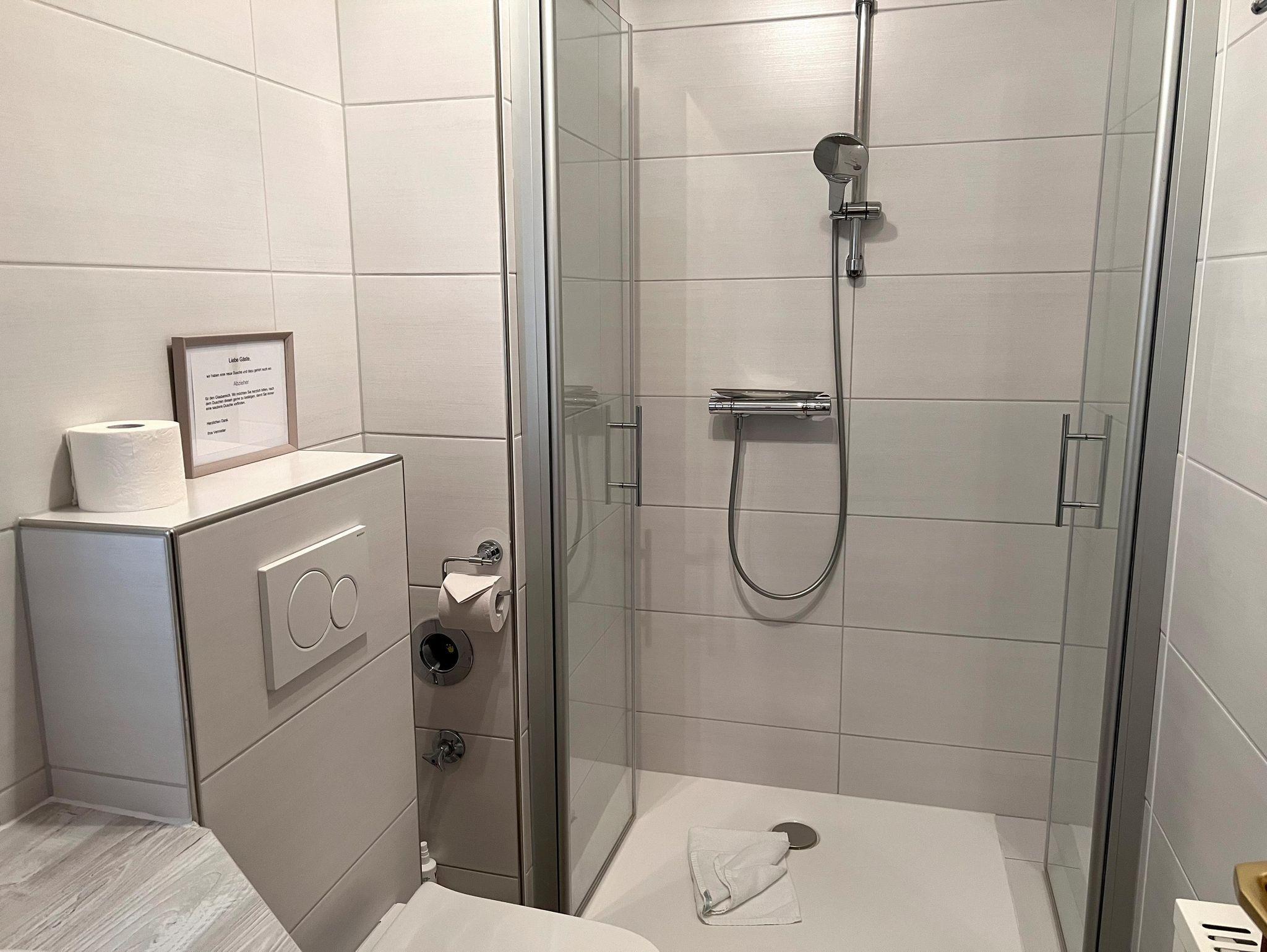 Bad: Dusche, Waschbecken, WC, Duschkabine, Spiegel, E-Heizung