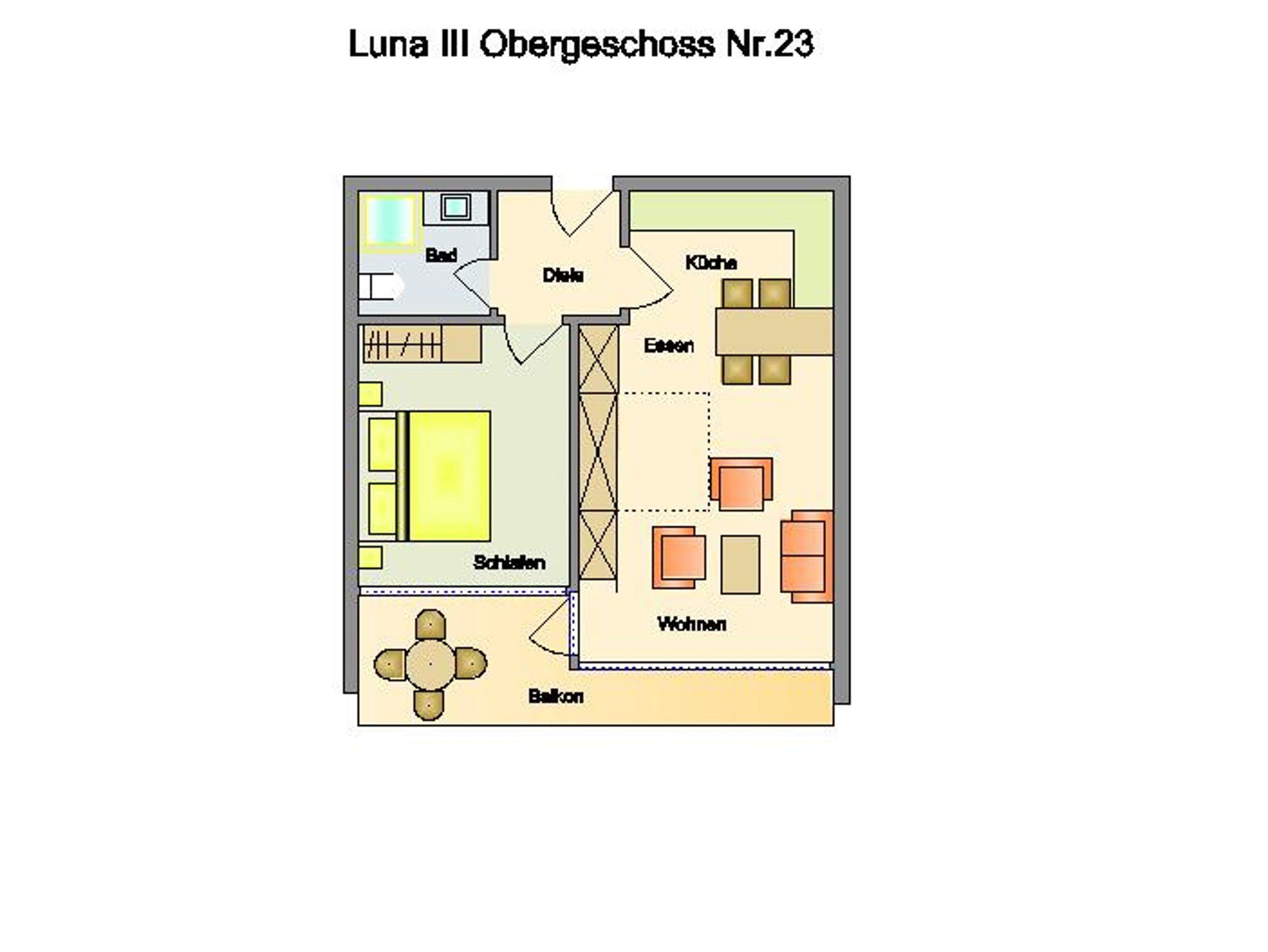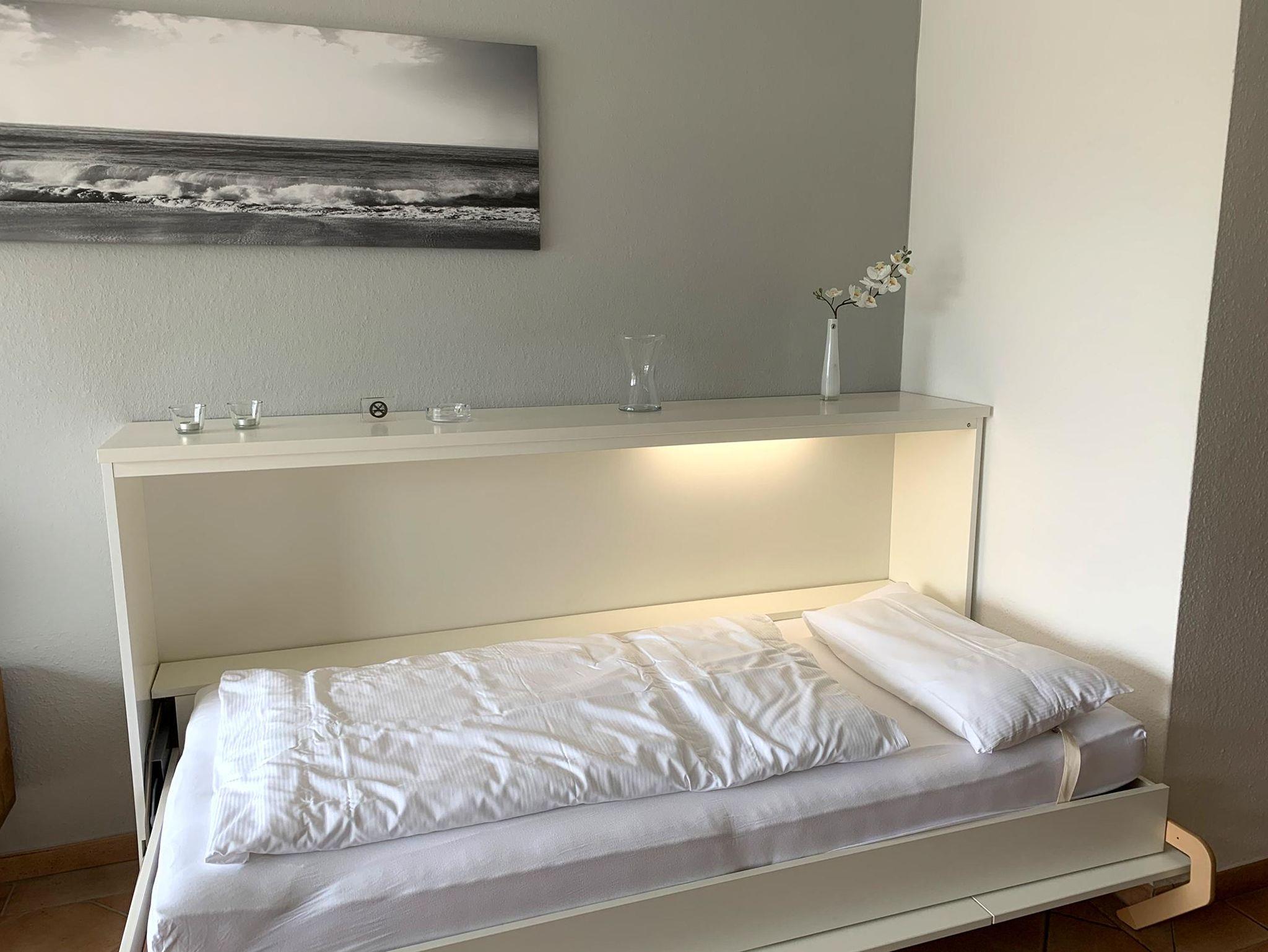 Eingangsbereich mit Garderobe, offener Wohnraum mit Essbereich und integrierten Einbauküche, Einzelschrankbett (90x200cm, Matratze ), direkter Zugang zur Südloggia mit Gartenmöbeln, von hier haben Sie einen wunderbaren Blick, Schlafzimmer mit Doppelbett (180x200cm,getrennte Matratzen), 1 Duschbad mit WC und Waschbecken.
