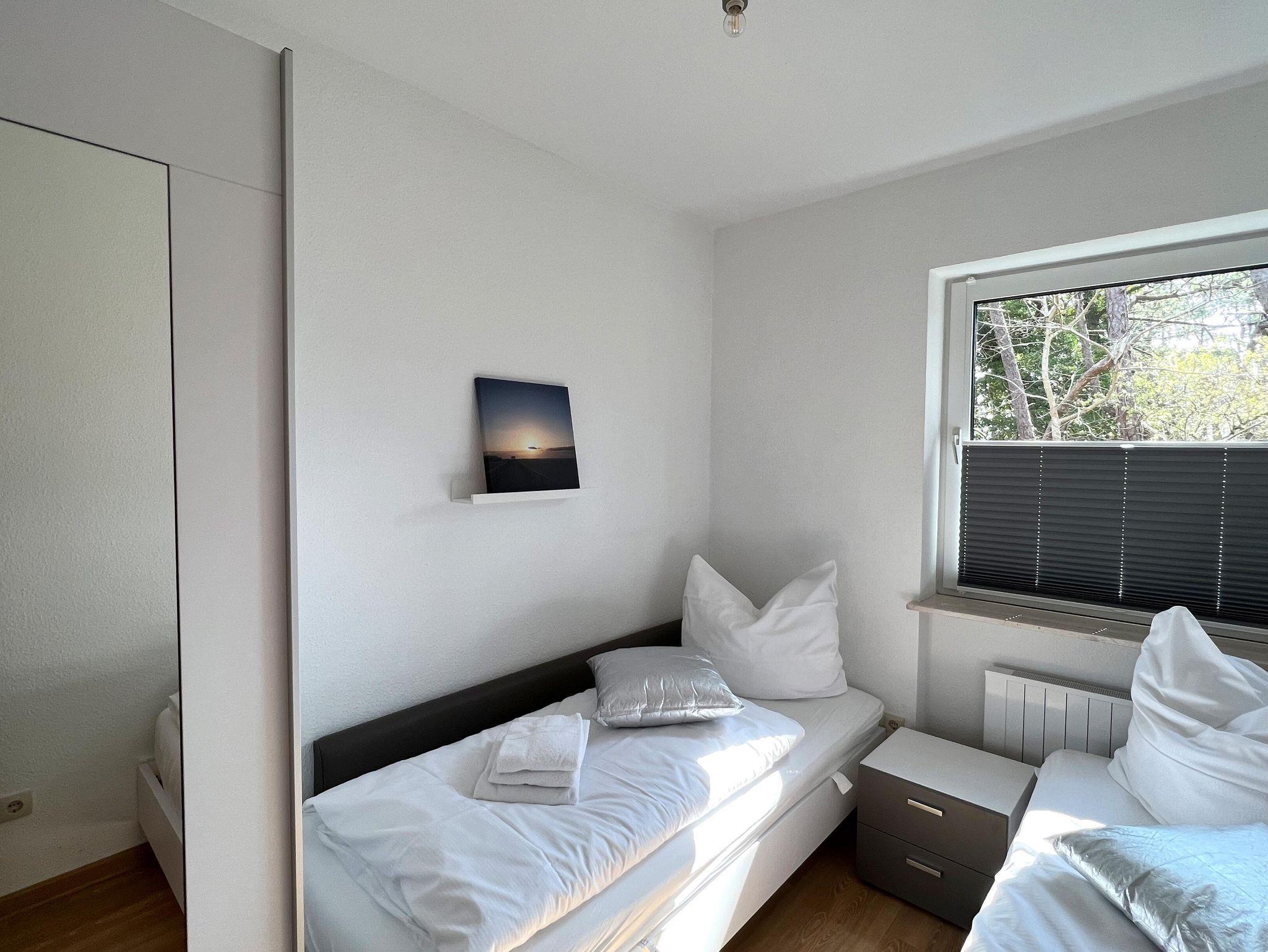 Schlafzimmer: 2 Einzelbetten, Nachttisch, 2 Ablagen, Kleiderschrank, Stuhl