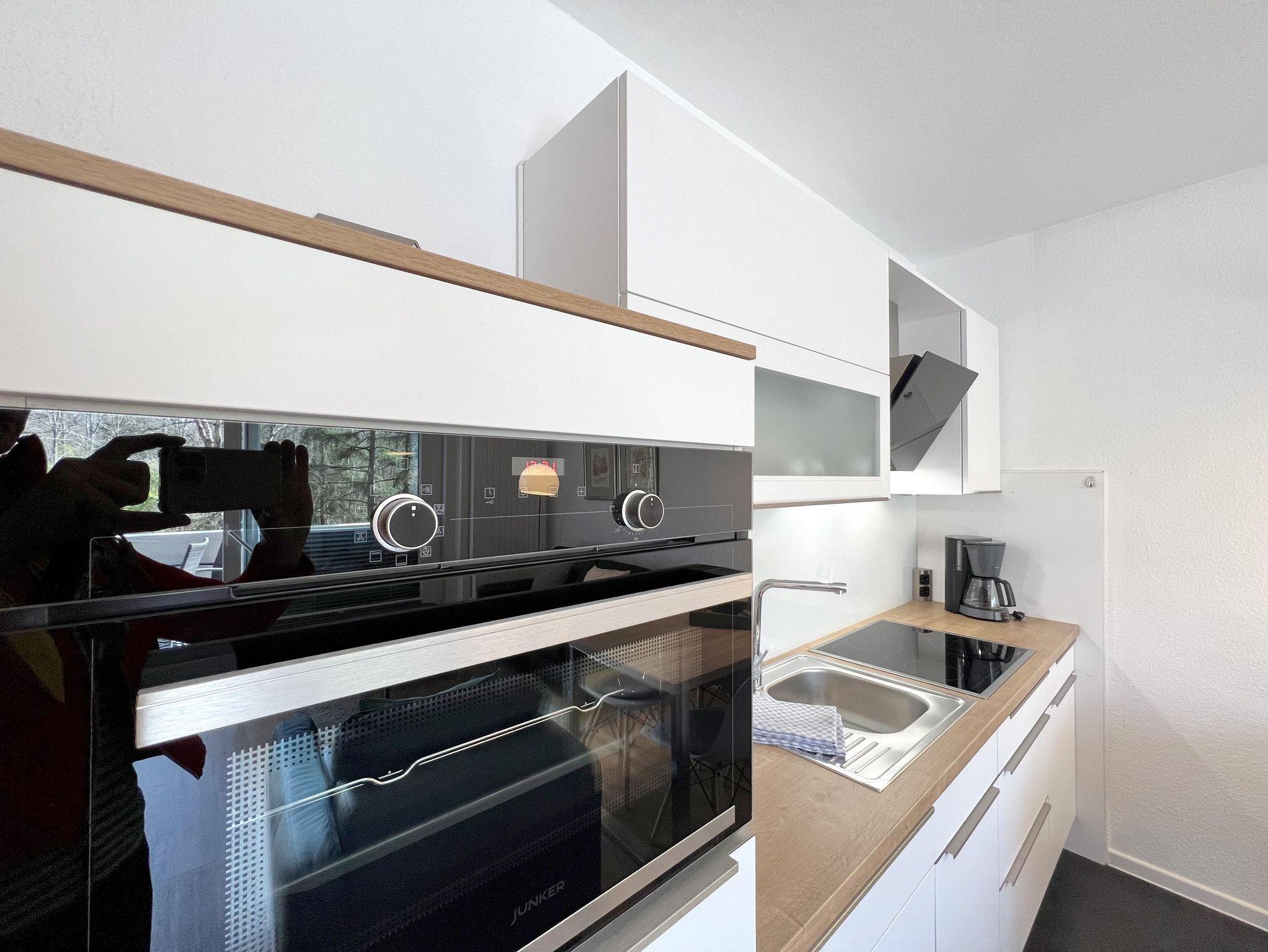 Wohnzimmer: Couch, Couchtisch, 2 Sessel, Stehlampe, TV-Schrank, Schrankdoppelbett, Schrankregal, Kleiderschrank, Kabel-TV, Telefon, Stereoanlage mit CD-Player, Esstisch, 4 Stühle, Küchenzeile, 4 Plattenherd mit Backofen, Dunstabzugshaube, Kühlschrank, Spülmaschine, Kaffeemaschine, Wasserkocher, Eierkocher, Toaster, Handmixer, Tischstaubsauger, Geschirr, Kochtöpfe