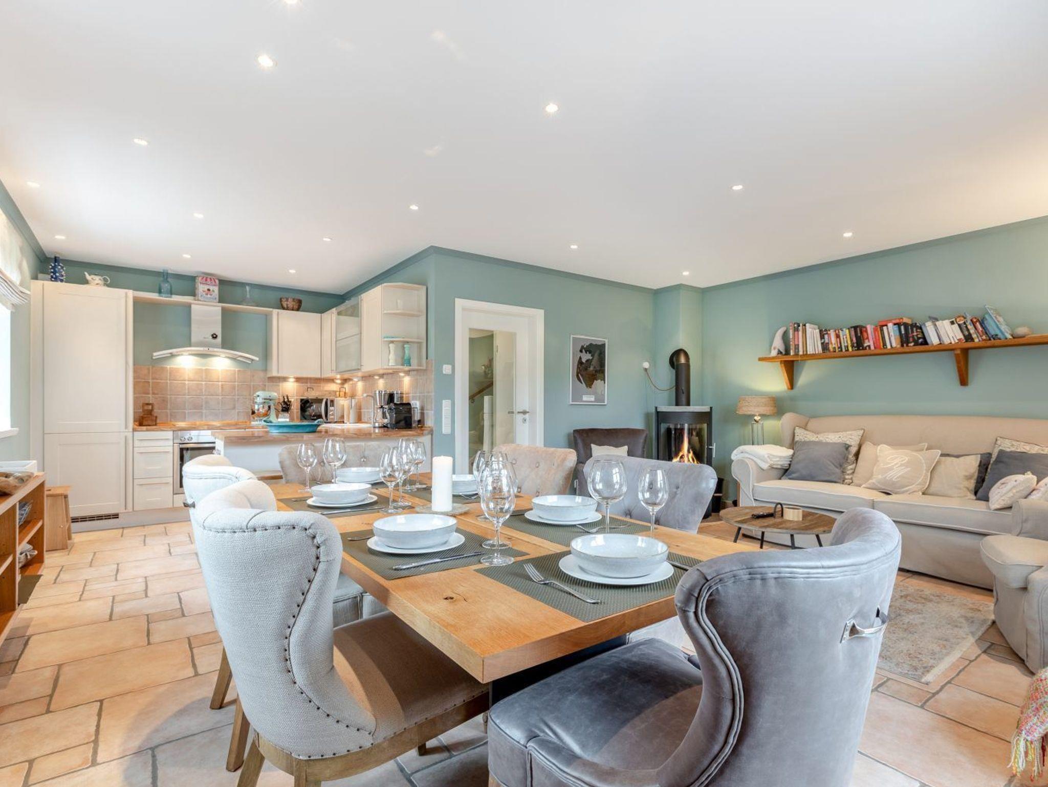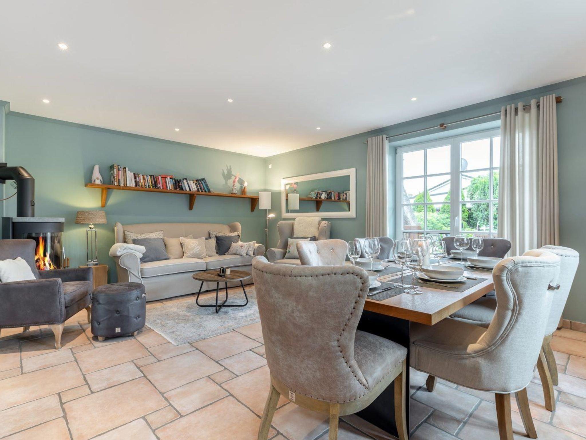 Wohnzimmer mit großem Sofa, Kaminofen, SMART-TV, Soundsystem und Esstisch. Zugang zur möblierten Südwest-Terrasse mit Strandkorb. Offene Küche mit Backofen, Mikrowelle, Geschirrspüler, Kühlschrank und Nespresso-Maschine.