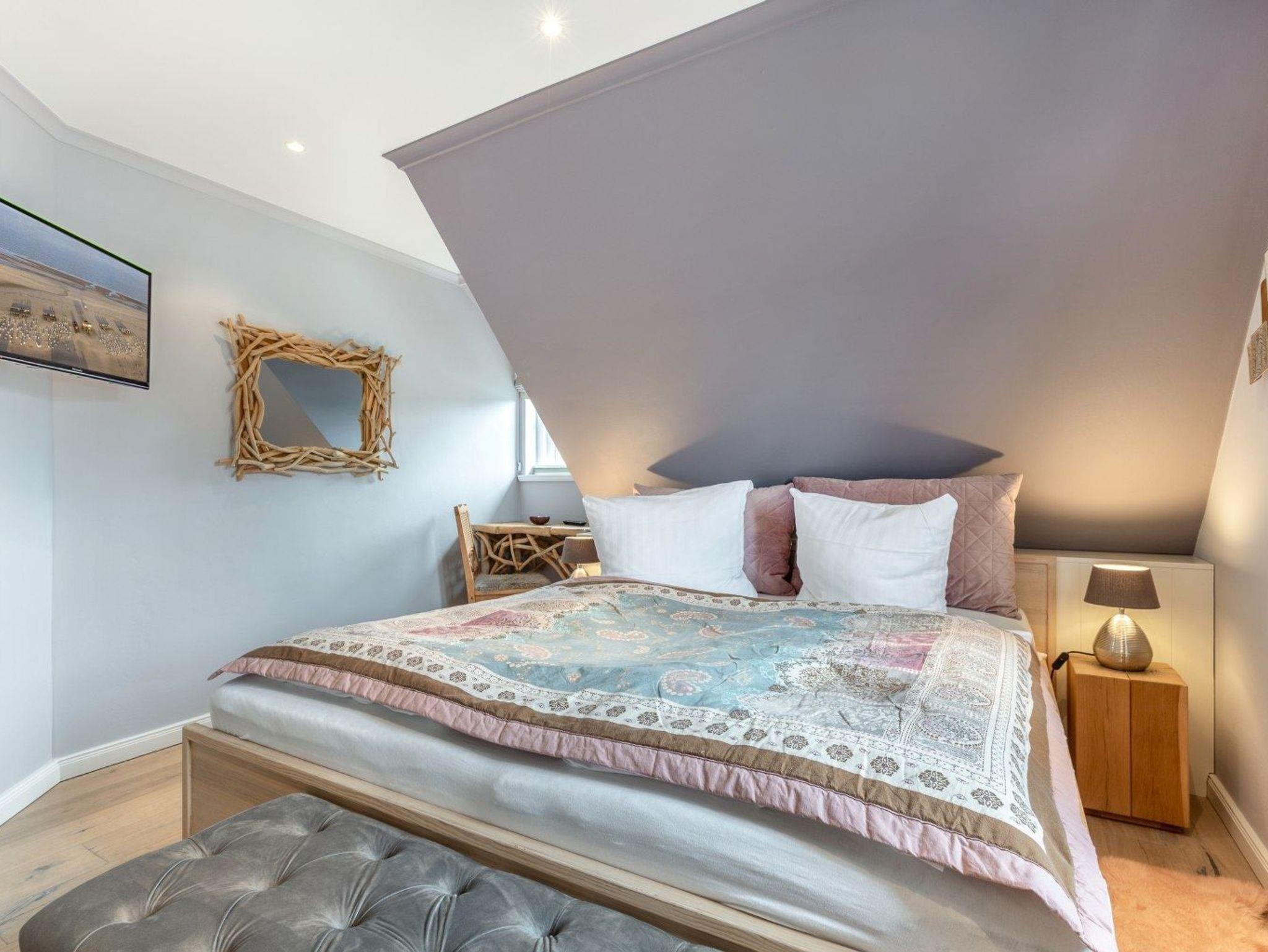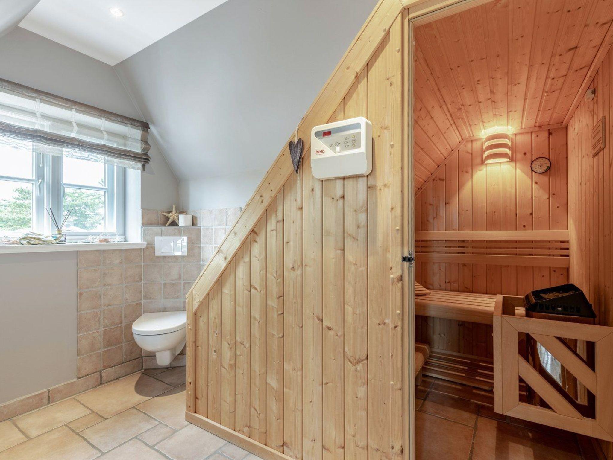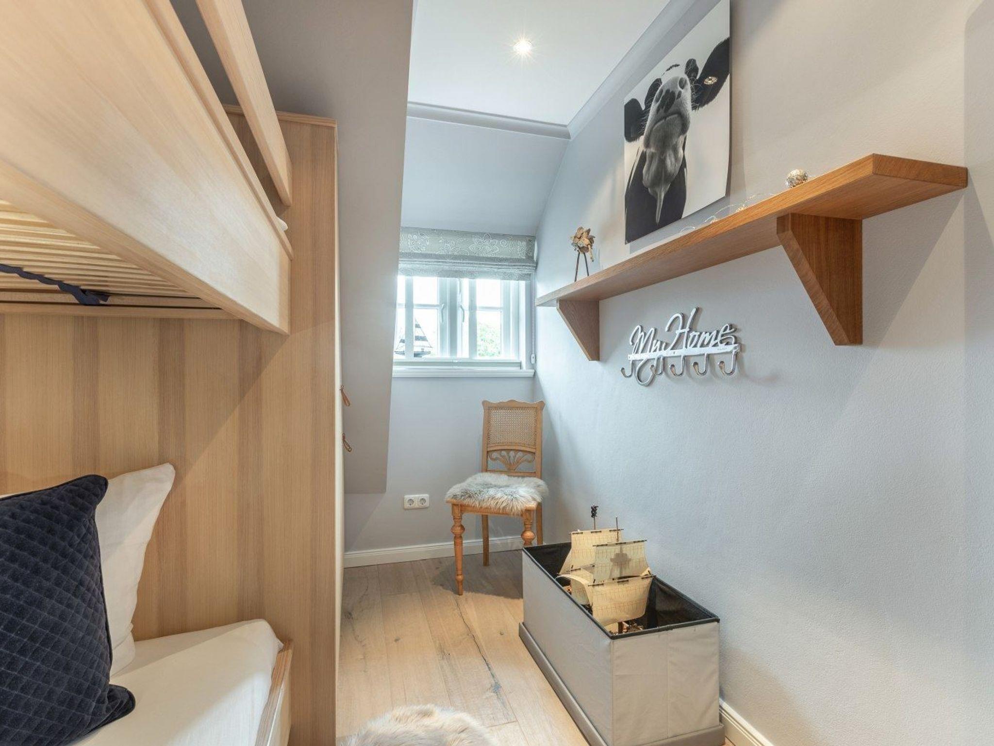 3 Schlafzimmer: Doppelbett (OG), Etagenbetten (OG), 2 Einzelbetten (DG, kombinierbar). 2 Bäder: Duschbad (EG), Vollbad mit Sauna (OG).