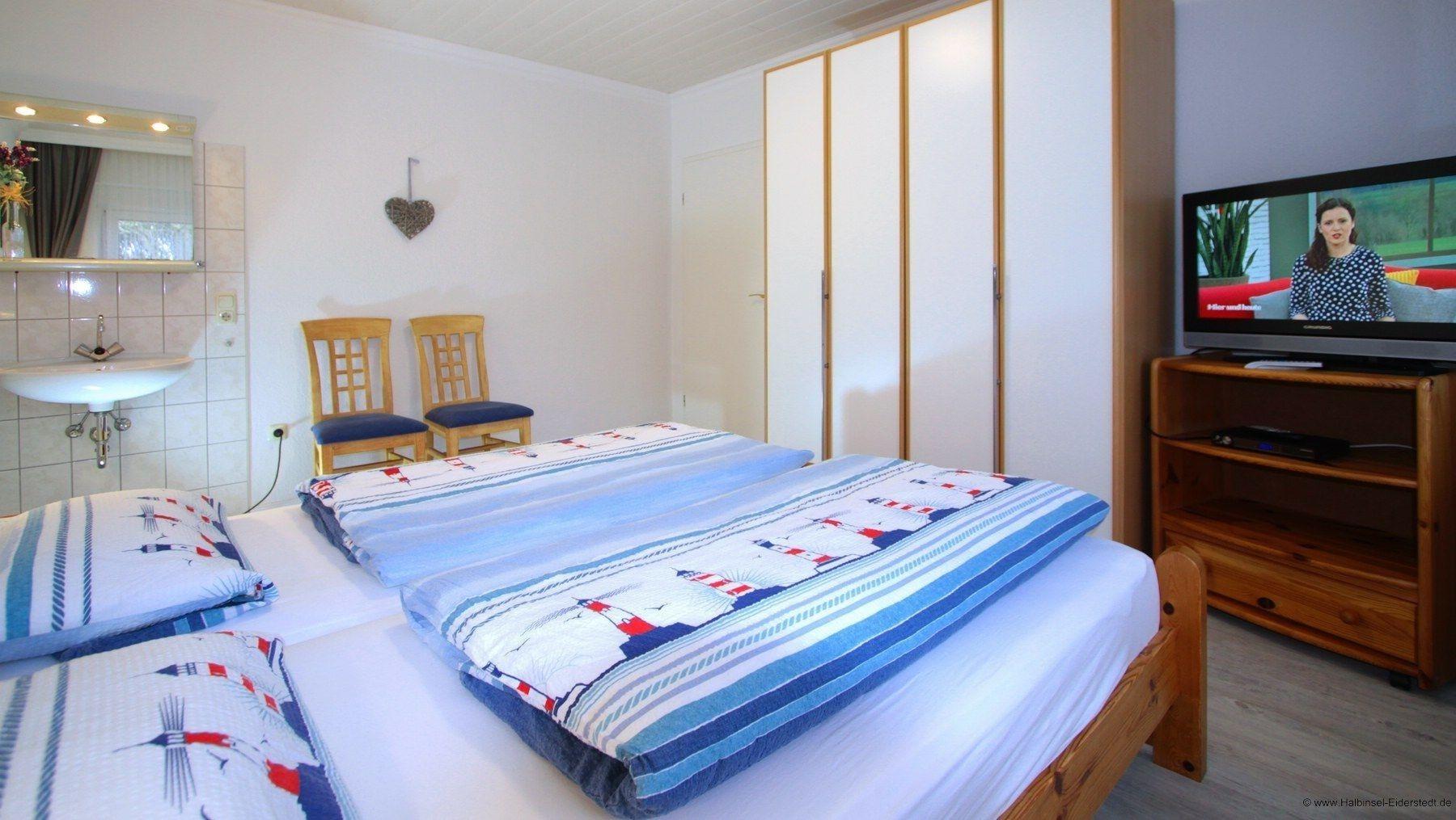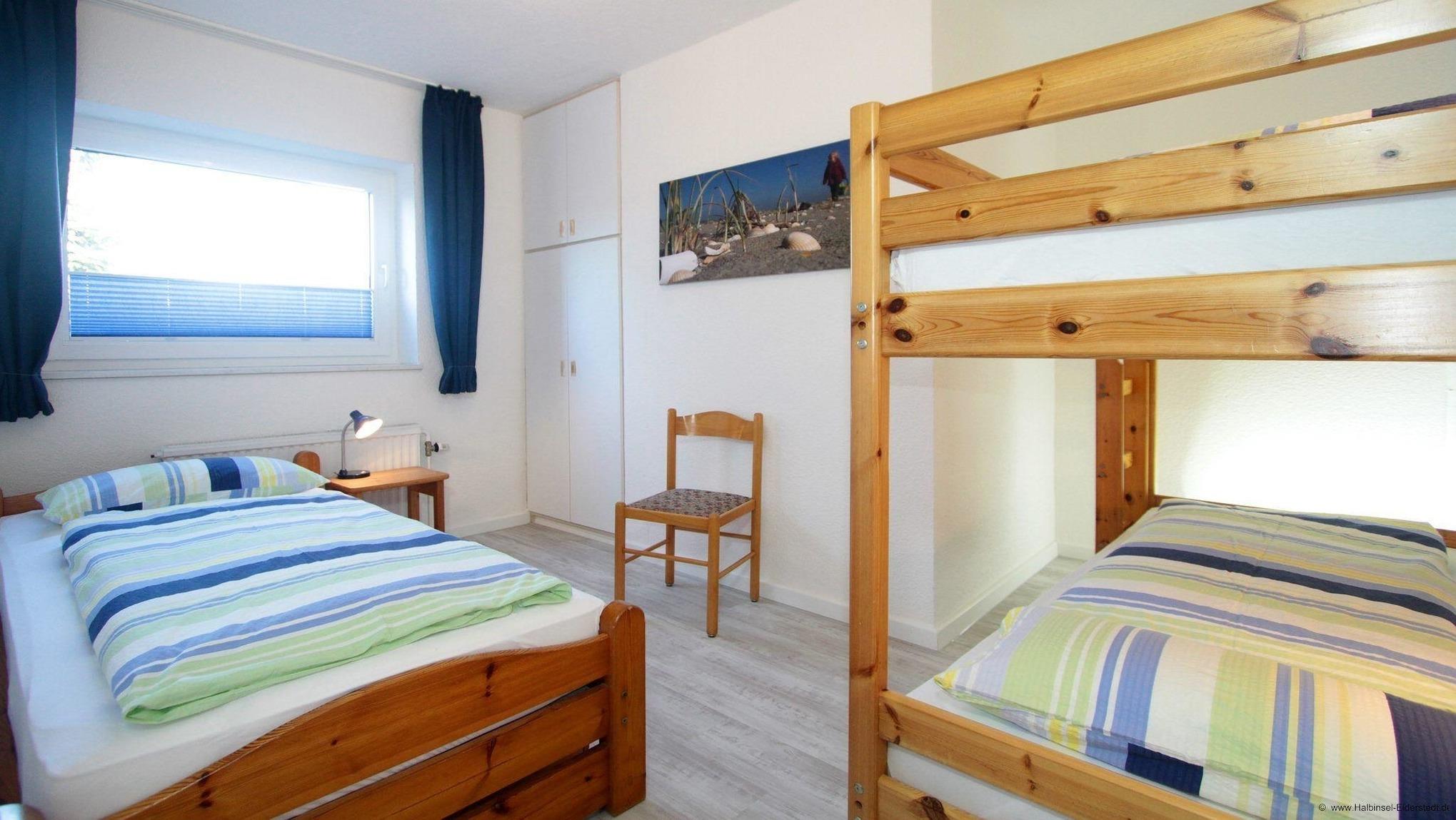 Unsere gemütliche Nichtraucher Ferienwohnung ist ideal geschnitten. Es erwartet Sie ein Schlafzimmer mit Doppelbett, Kleiderschrank, Nachttischen und Fernseher. Der Boden ist mit Laminat ausgelegt und das große Fenster verleiht dem Raum ein wohliges zuhause Gefühl. Das zweite Schlafzimmer ist zwei Einzelbetten eingerichtet, mit Laminatboden ausgelegt. Das Zimmer bietet auch Platz für Ihre privaten Sachen.