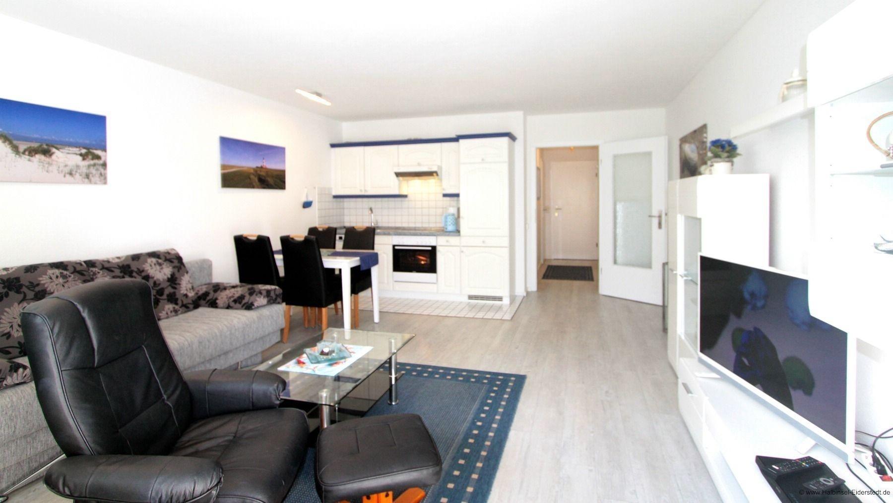 Im schönen Wohnzimmer stehen (Schlaf-)Sofa, Esstisch, Sessel und TV zur Verfügung. Die Küchenzeile ist in das Wohnzimmer integriert. Die moderne Küchenzeile ist mit Kaffeemaschine, Spülmaschine und Backofen ausgestattet, so dass eine bequeme Eigenversorgung gewährleistet ist.