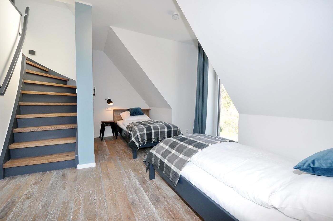 Obergeschoss: ein Schlafzimmer mit Doppelbett (180 x 200 cm - Einzelmatratzen) und TV, ein Schlafzimmer mit 2 Einzelbetten (90 x 190 cm) und TV, ein Duschbad/ WC