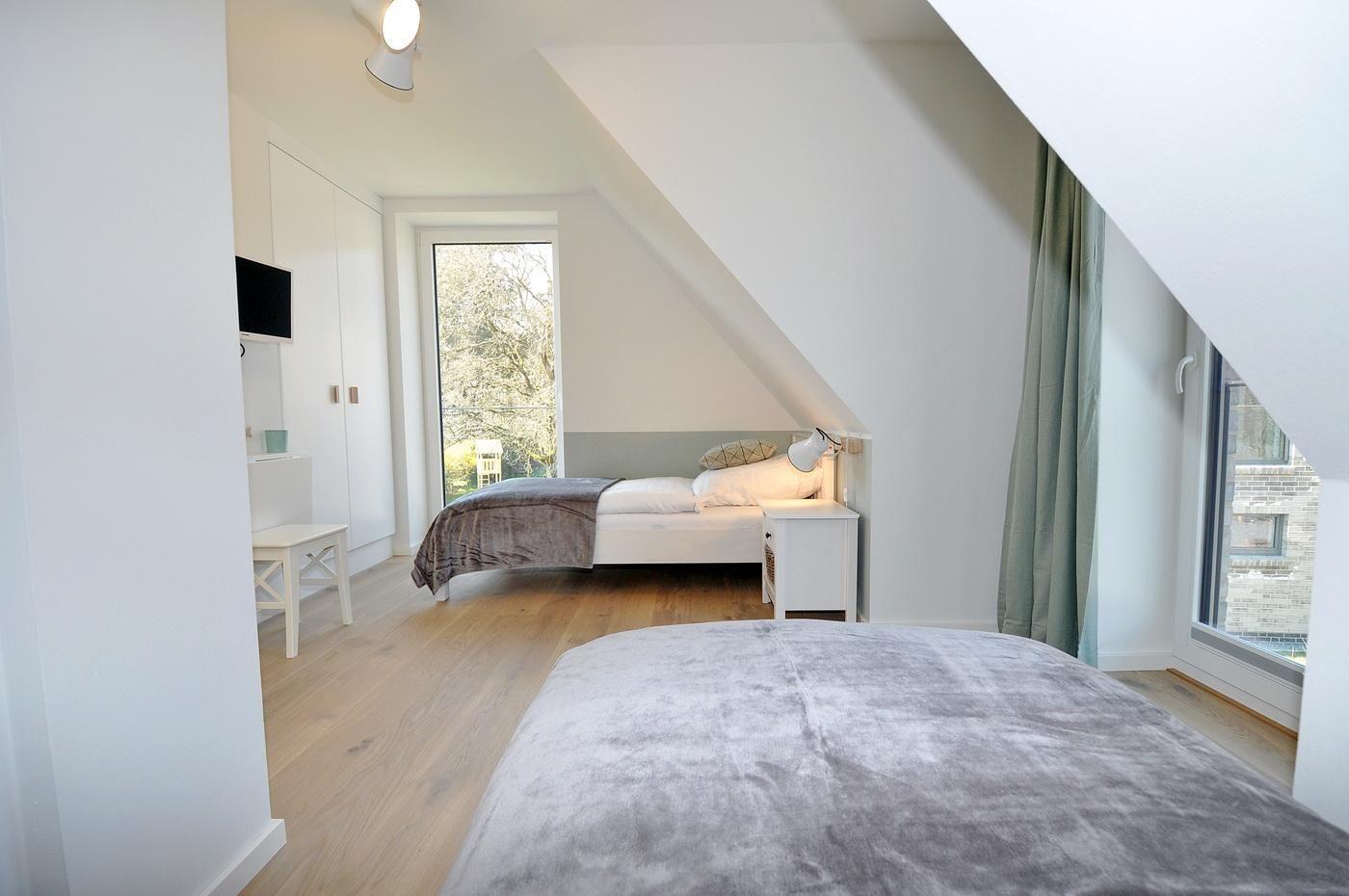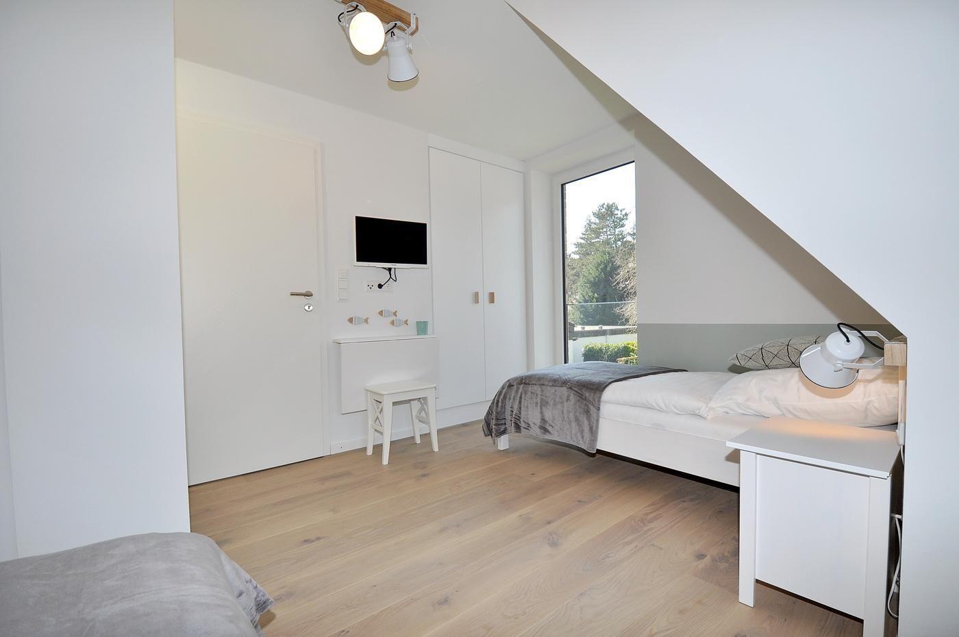 Obergeschoss: ein Schlafzimmer mit Doppelbett (180 x 200 cm - Einzelmatratzen) und TV, ein Schlafzimmer mit 2 Einzelbetten (90 x 190 cm) und TV, ein Duschbad/ WC