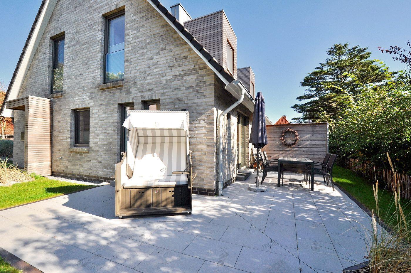 Auf der Terrasse befinden sich Gartenmöbel und ein Strandkorb, zudem gibt es einen kleinen Gemeinschaftsspielplatz im Außenbereich.