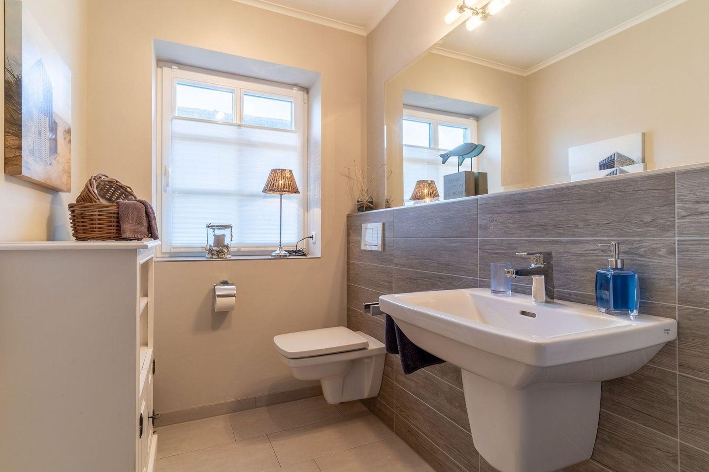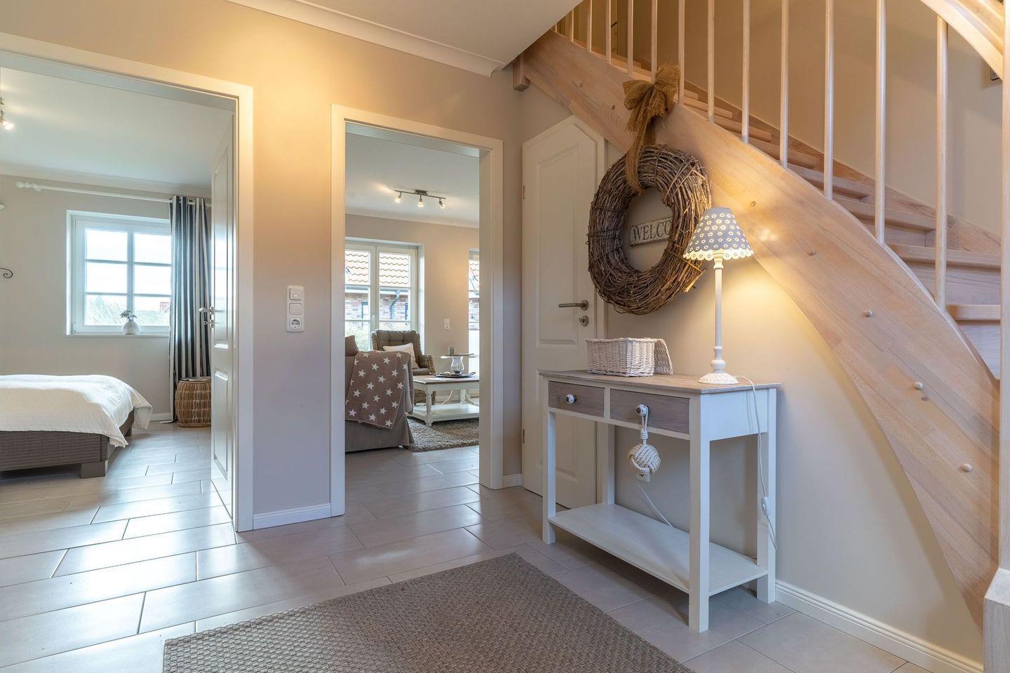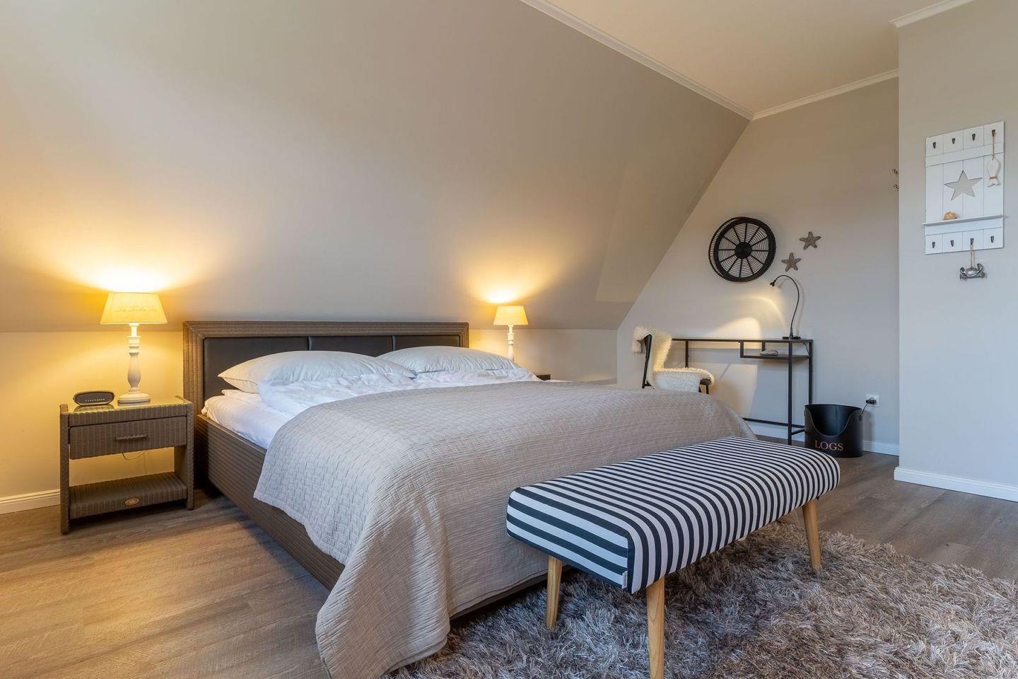 Dieses wunderschöne Doppelhaus unter Reet verfügt über ca. 113 m² Wohnfläche und bietet großzügigen Platz für 6 Personen. Im Erdgeschoss befindet sich der lichtdurchflutete Wohnraum mit TV, Kamin, einer großzügigen Sitzecke. Die offene Wohnküche verfügt über hochwertige Geräte und ist voll ausgestattet für gemeinsames Kochen. Die Wohnräume sind mit exklusiven Möbeln eingerichtet. An den Wohnbereich schließen sich ein Flur, sowie ein Hauswirtschaftsraum. Ebenso ist im Erdgeschoss ein Doppelschlafzimmer mit Gästebad und Dusche. Das gesamte Erdgeschoss verfügt über geschmackvolle Fußbodenfliesen.