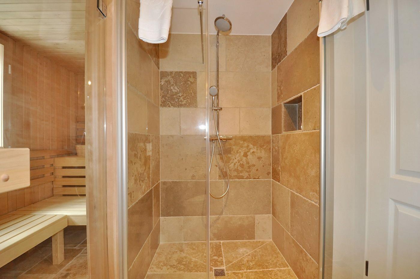 Obergeschoss: ein Schlafzimmer mit Doppelbett (200 x 200 cm - Einzelmatratzen), TV und Duschbad en Suite, ein Schlafzimmer mit Doppelbett (200 x 200 cm - Einzelmatratzen) und Duschbad en Suite, ein Schlafzimmer mit Doppelbett (200 x 200 cm - Einzelmatratzen), ein Duschbad mit integrierter Sauna