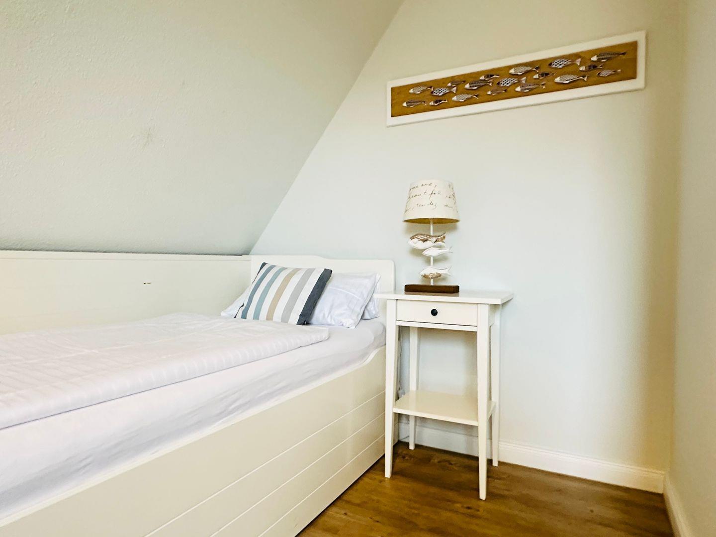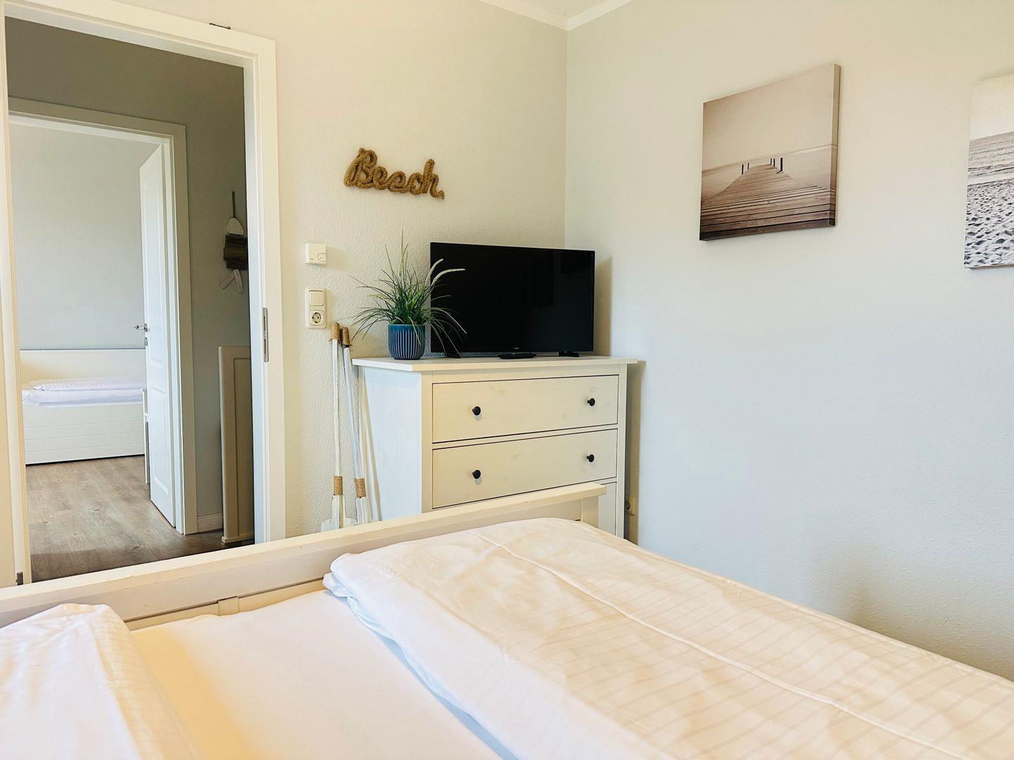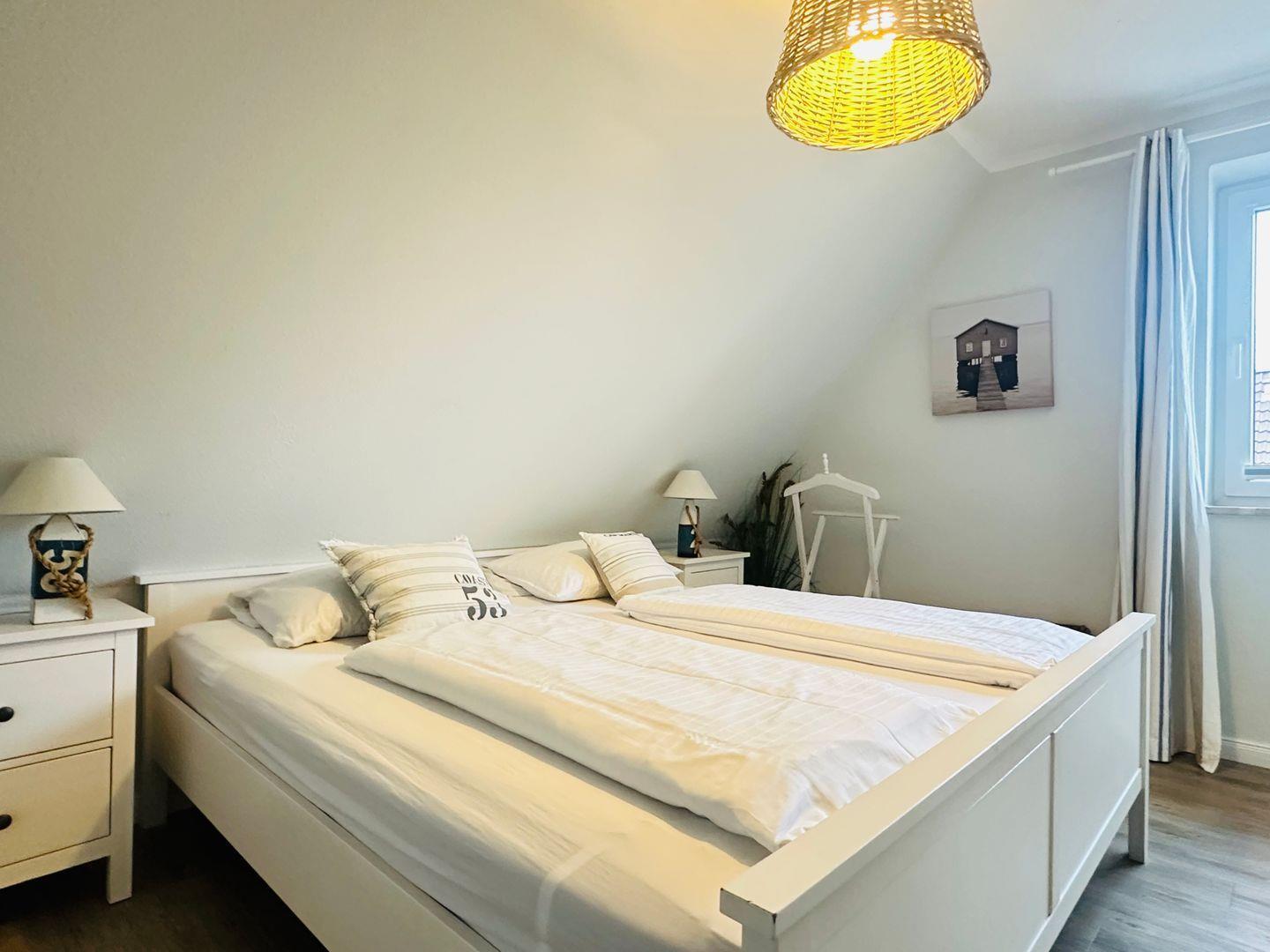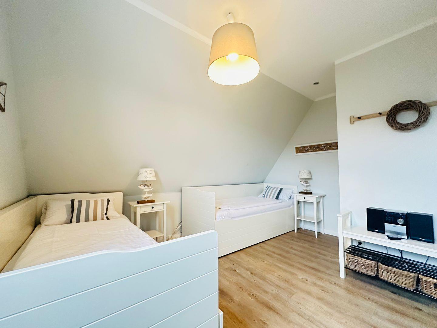 Im Obergeschoss finden Sie zwei gemütliche Schlafräume, in denen Sie sich nach einem ereignisreichen Tag perfekt entspannen können. Verdunklungsplissees sorgen für eine erholsame Nachtruhe.