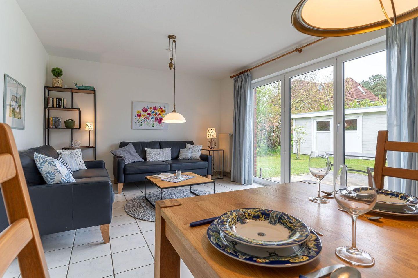 Die Terrasse mit Garten liegt in Richtung Südwesten, und ein Gartenhaus bietet Platz für Strandutensilien und Fahrräder. Ein reservierter Auto-Stellplatz steht vor dem Haus zur Verfügung.
