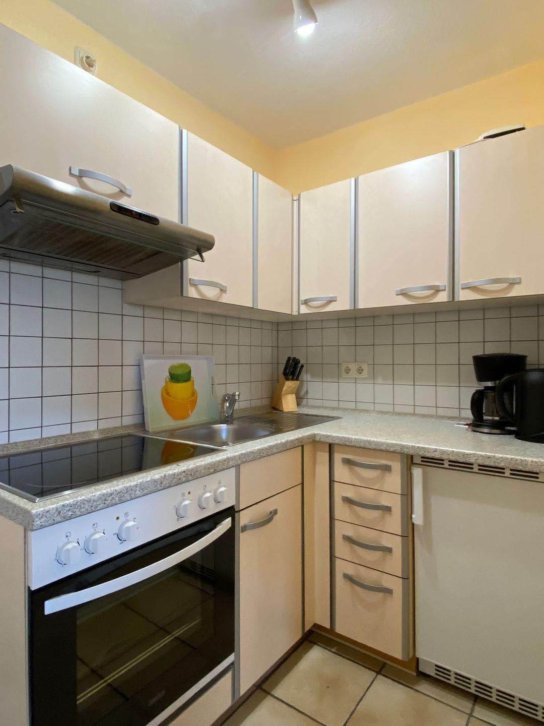 Die Küche ist separiert mit einem Durchbruch und hat u. a. einen Herd mit Backofen. ein Duschbad, sowie 2 Schlafräume sind vorhanden.