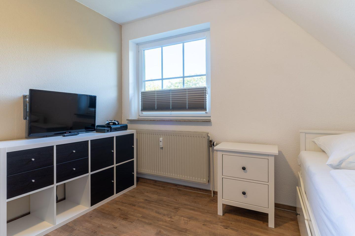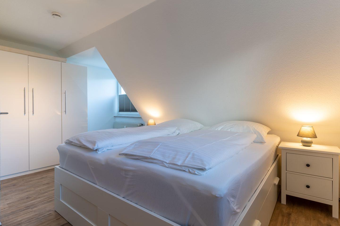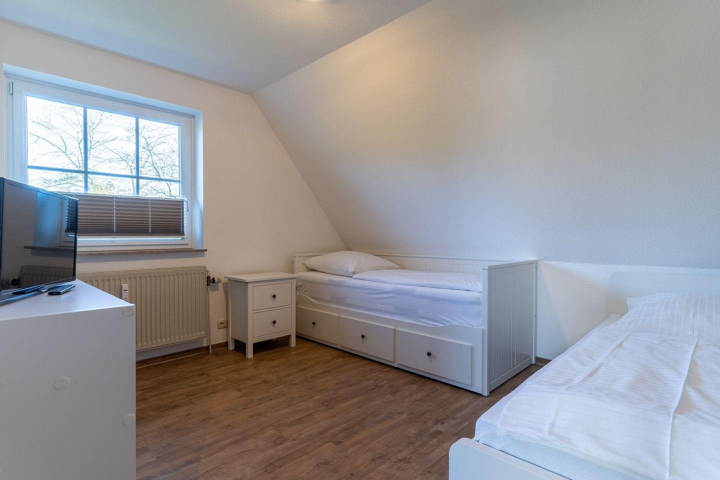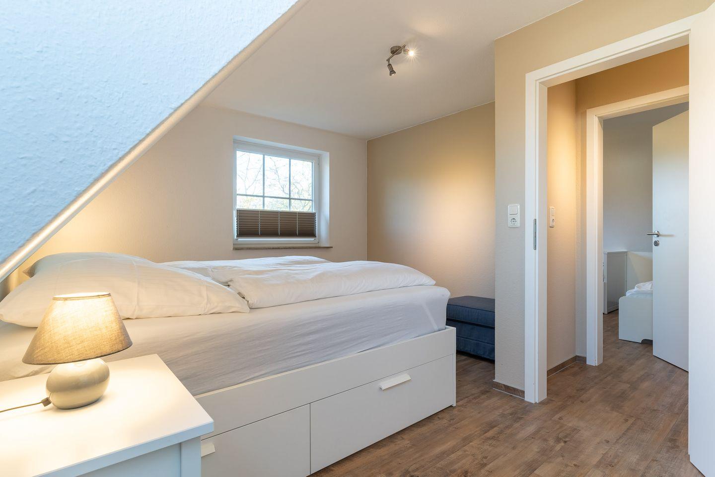 Obergeschoss: 2 Schlafräume, 4 Betten (1 Doppelbett, 2 Einzelbetten).