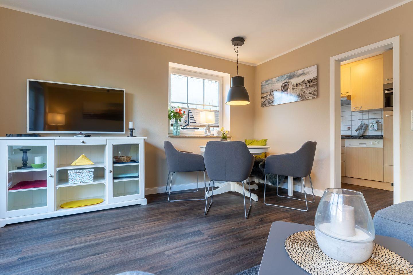 Das Reihenendhaus Kiki wurde im modernen, maritimen Stil eingerichtet und hat eine Größe von ca. 68 qm, verteilt auf 2 Etagen. Das Reihenendhaus ist unter anderem mit Kabel-TV und Flachbildschirmen im Wohnzimmer, W-LAN, Mikrowelle, Waschmaschine, Geschirrspüler und Stereoanlage ausgestattet. Auch Bügeleisen, Bügelbrett und Fön sind vorhanden. Ein Gartenanteil, eine Terrasse mit Gartenmöbeln und ein PKW-Stellplatz stehen zur Verfügung.